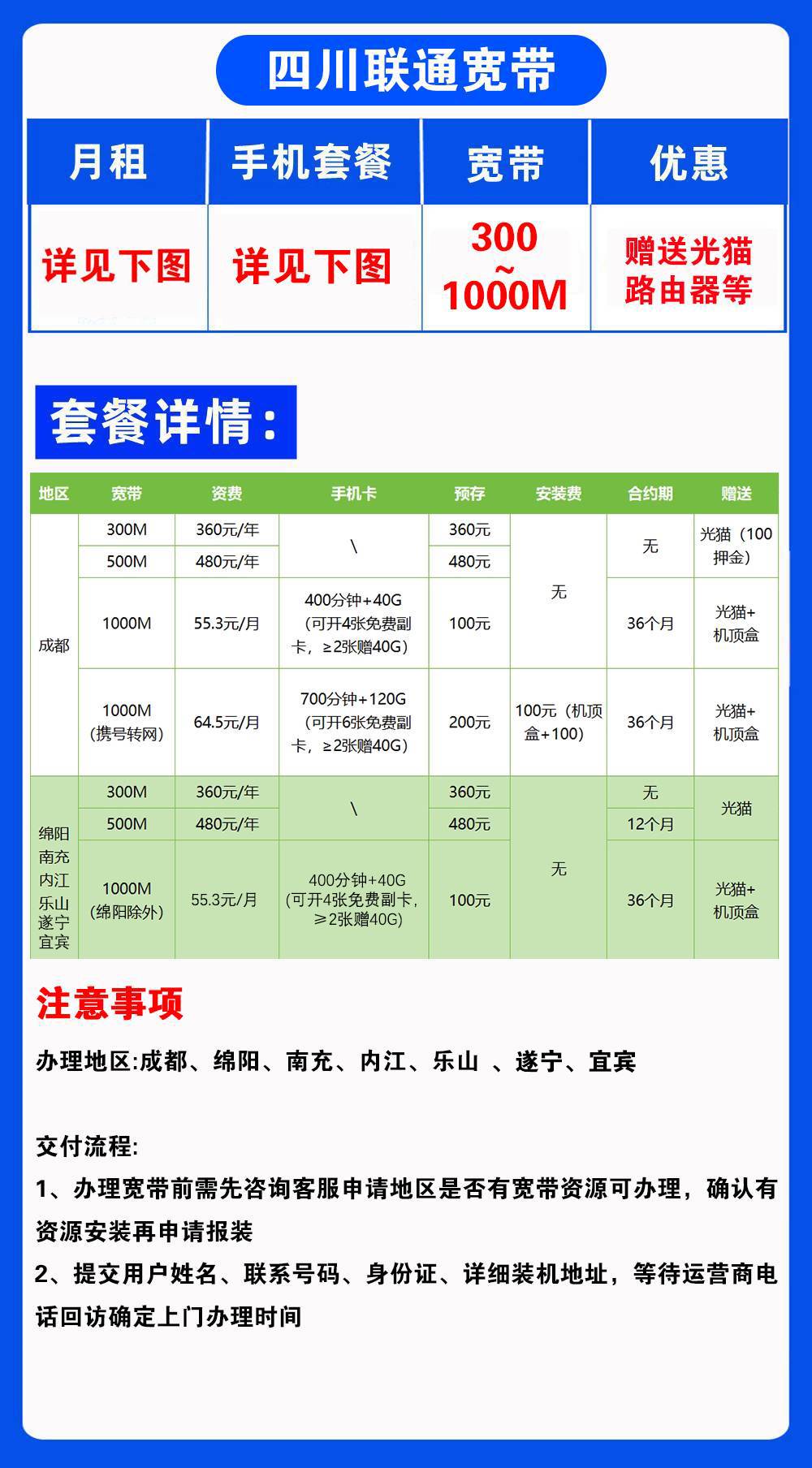 - 1000M:55.3元/月(可开4张免费副卡),100元,36个月,光猫+遂宁(绵阳除外),≥2张赠40G