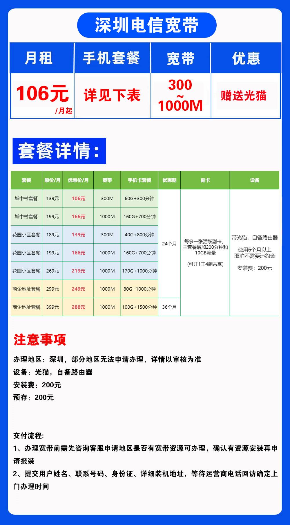 - 办理宽带前需先咨询客服申请地区是否有宽带资源可办理,确认有资源安装再申请报装