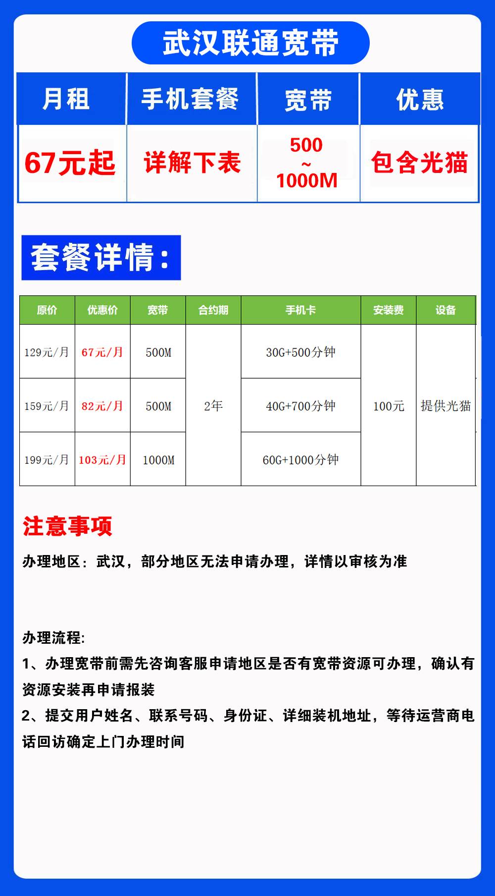 武汉联通宽带月租手机套餐宽带优惠50067元起详解