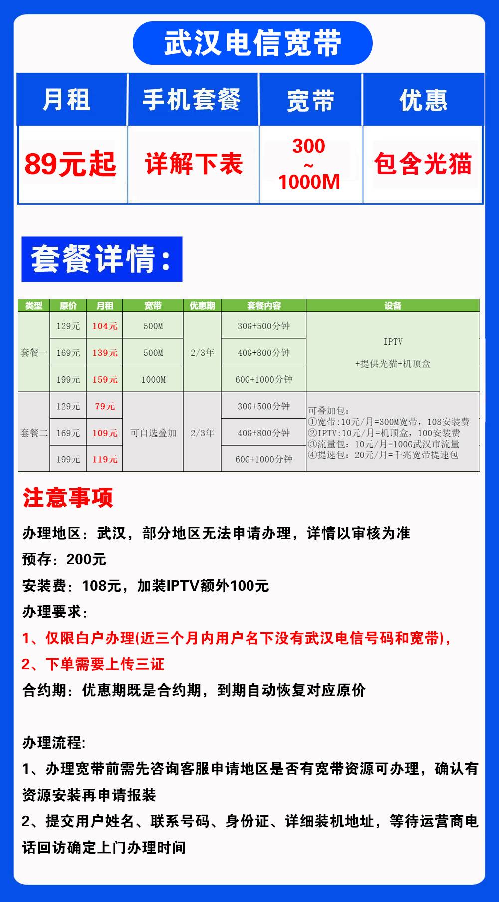- 仅限白户办理:近三个月内用户名下没有武汉电信号码和宽带