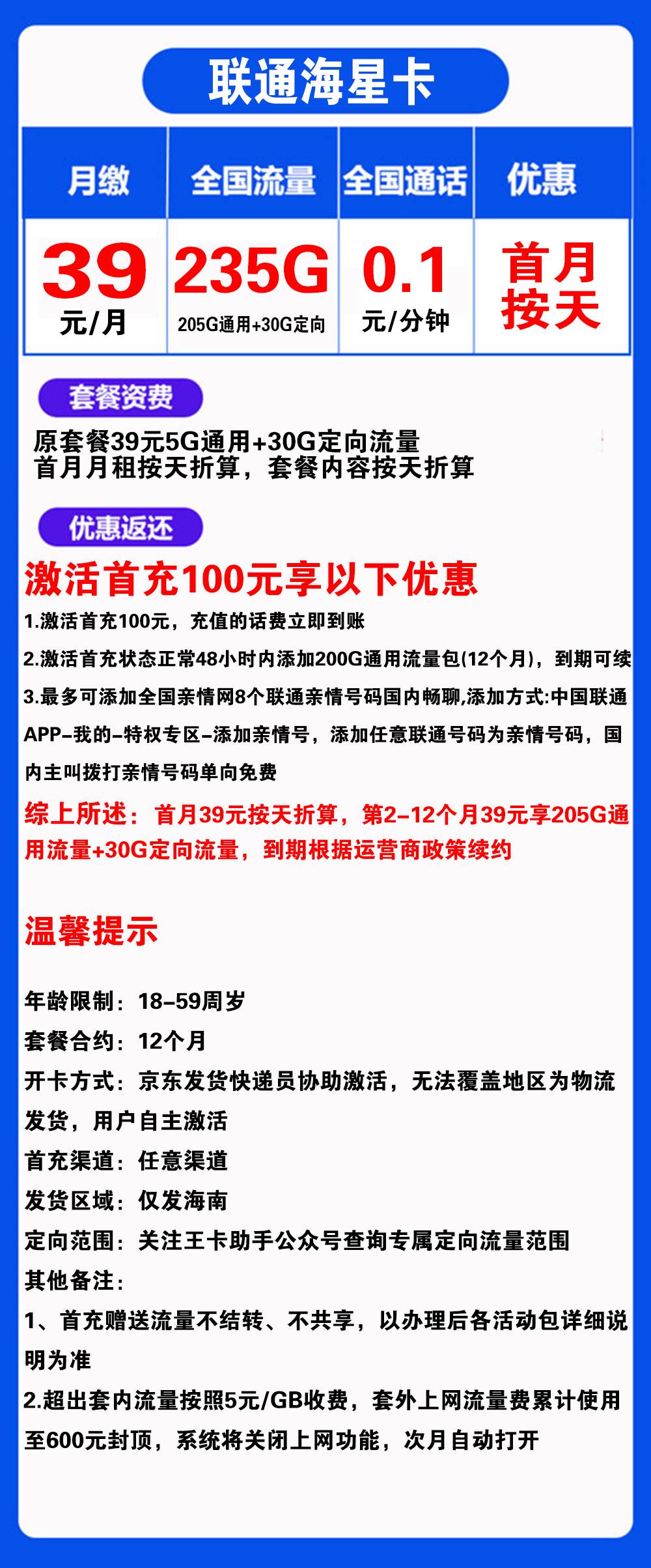 W1464/联通海星卡39元235GB流量+0.1元/分钟通话【仅发海南】