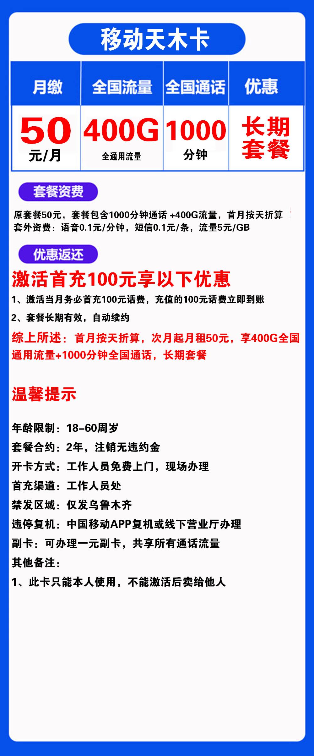 X1471/移动天木卡50元400G流量+1000分钟通话【仅发乌鲁木齐】【长期套餐】