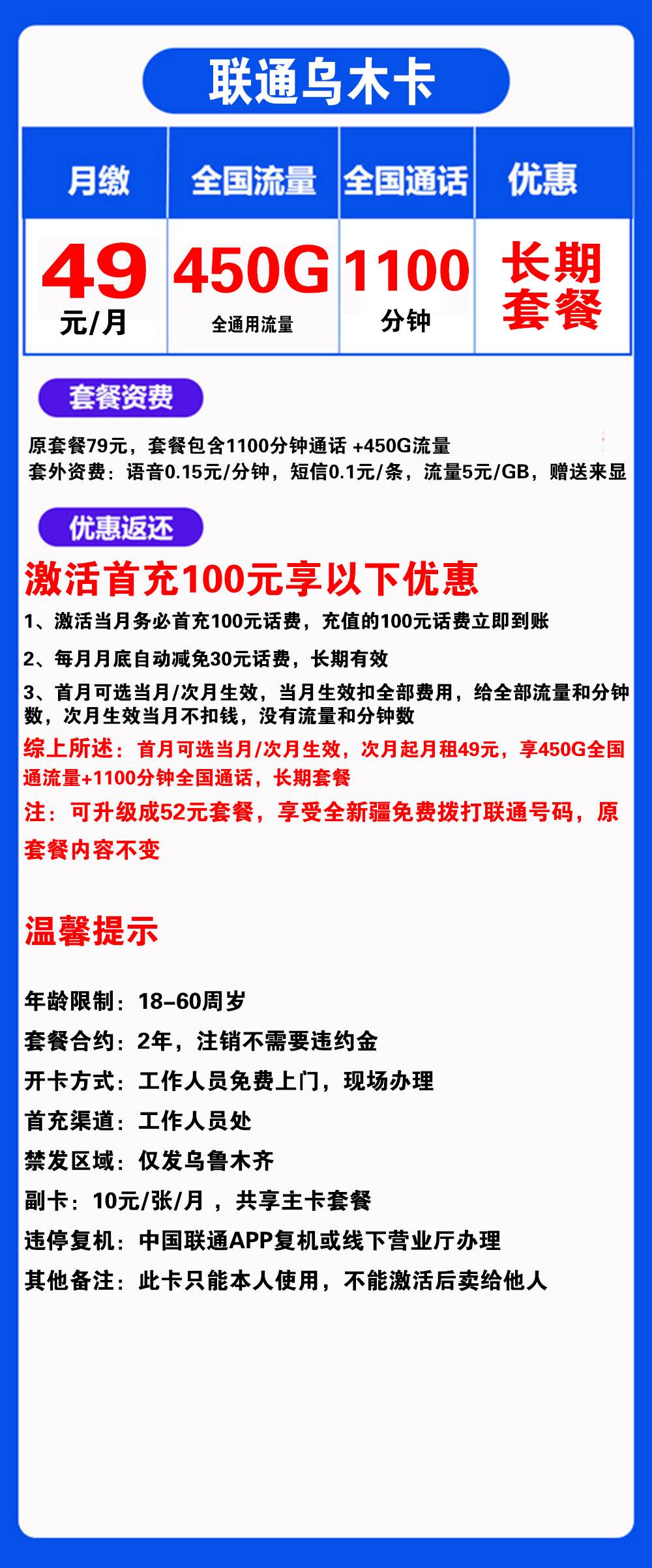 X1469/联通乌木卡49元450G流量+1100分钟通话【仅发乌鲁木齐】【长期套餐】
