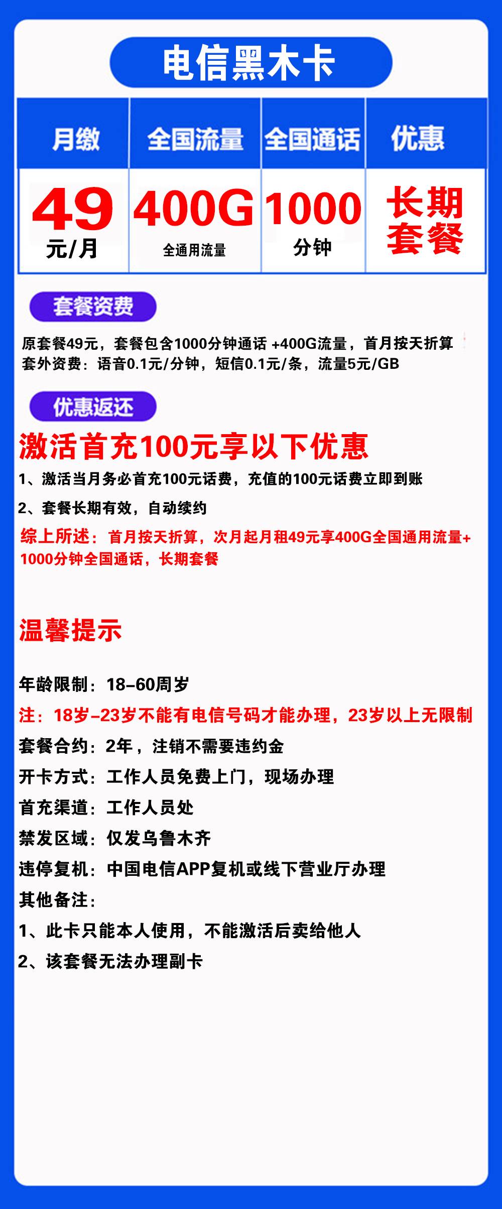 X1470/电信黑木卡49元400G流量+1000分钟通话【仅发乌鲁木齐】【长期套餐】