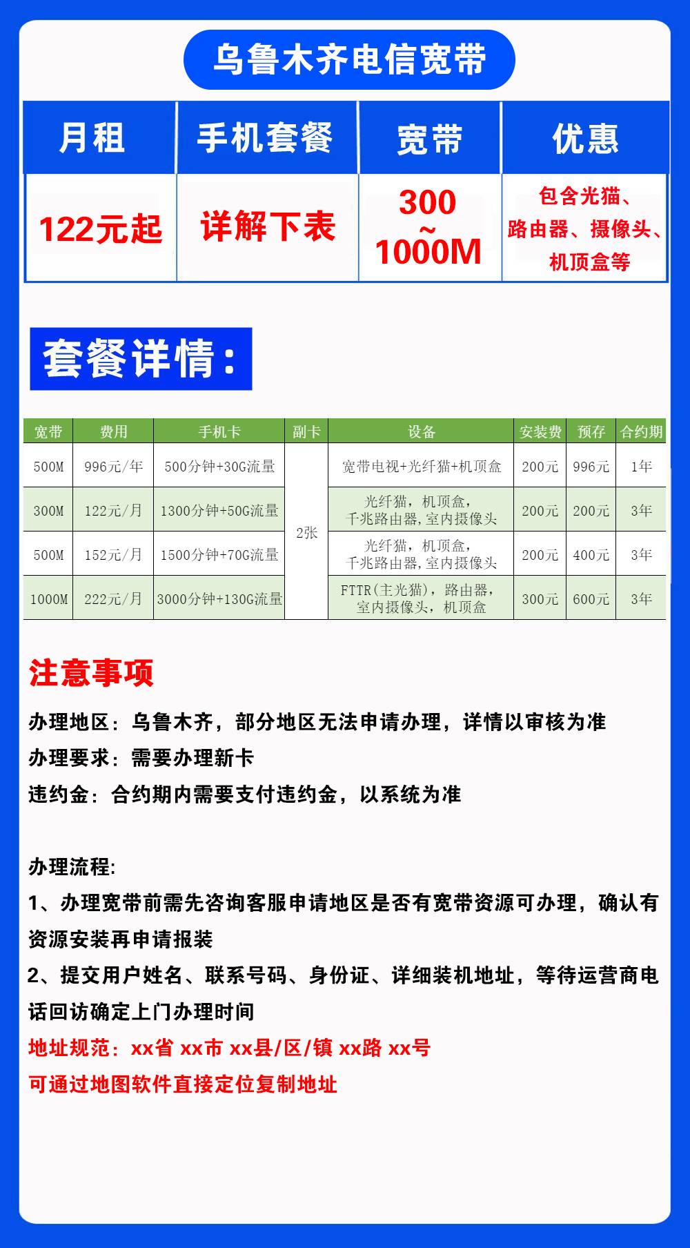 乌鲁木齐电信宽带月租手机套餐宽带优惠300包含光猫、122元起详解