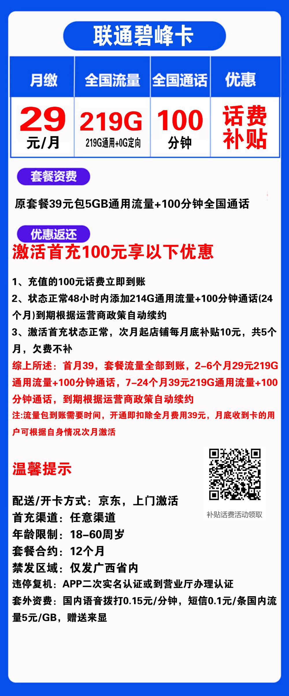 W1474/联通碧峰卡29元219G流量+100分钟通话【仅发广西】