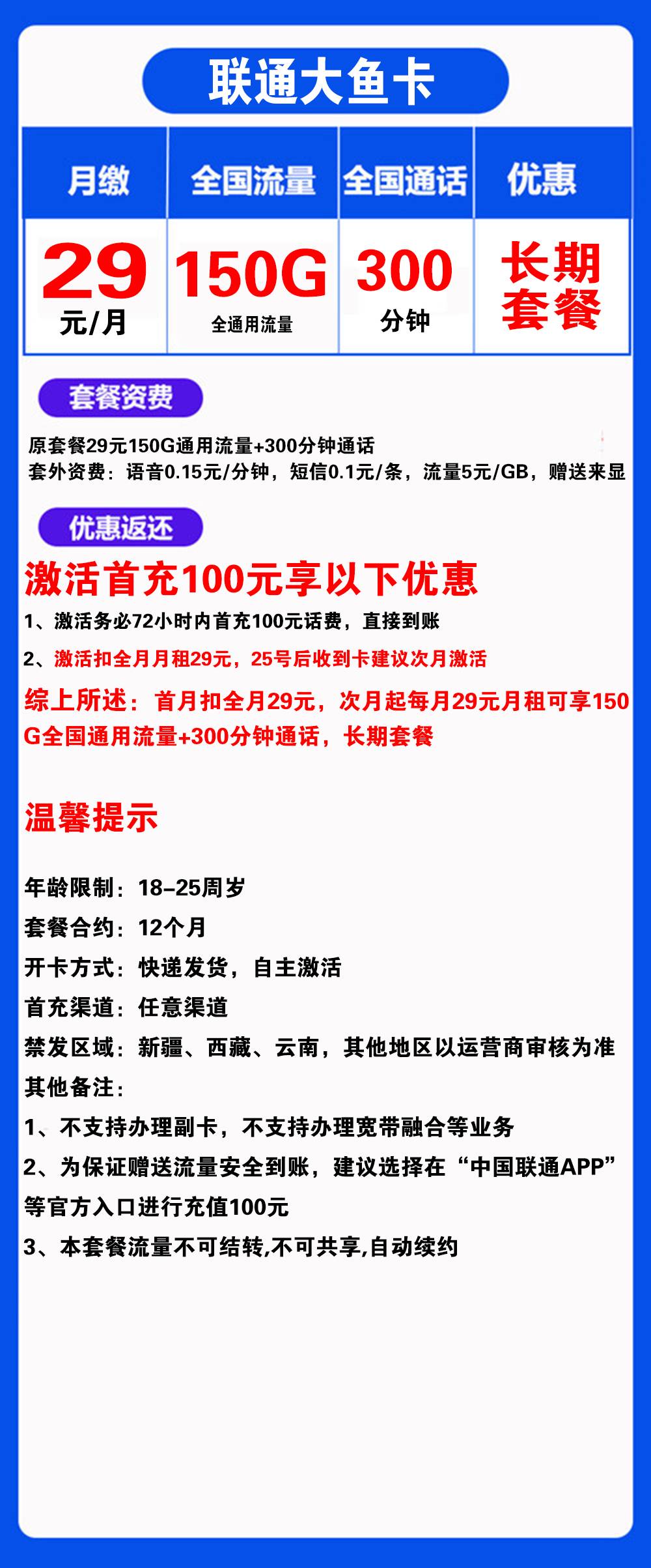 - 次月起每月29元月租可享150G全国通用流量+300分钟通话,长期套餐