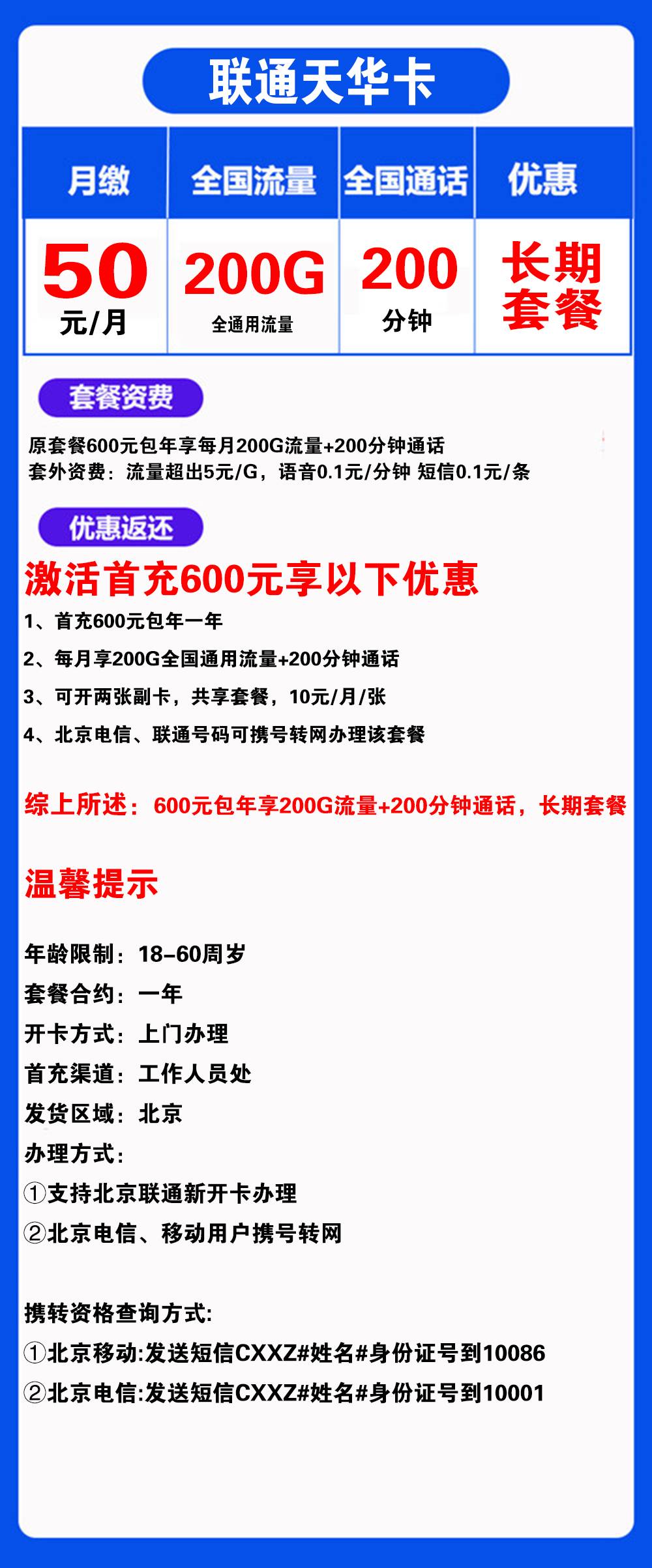 X1499/联通天华卡600元包年-月享200G流量+200分钟通话【仅发北京】【长期套餐】