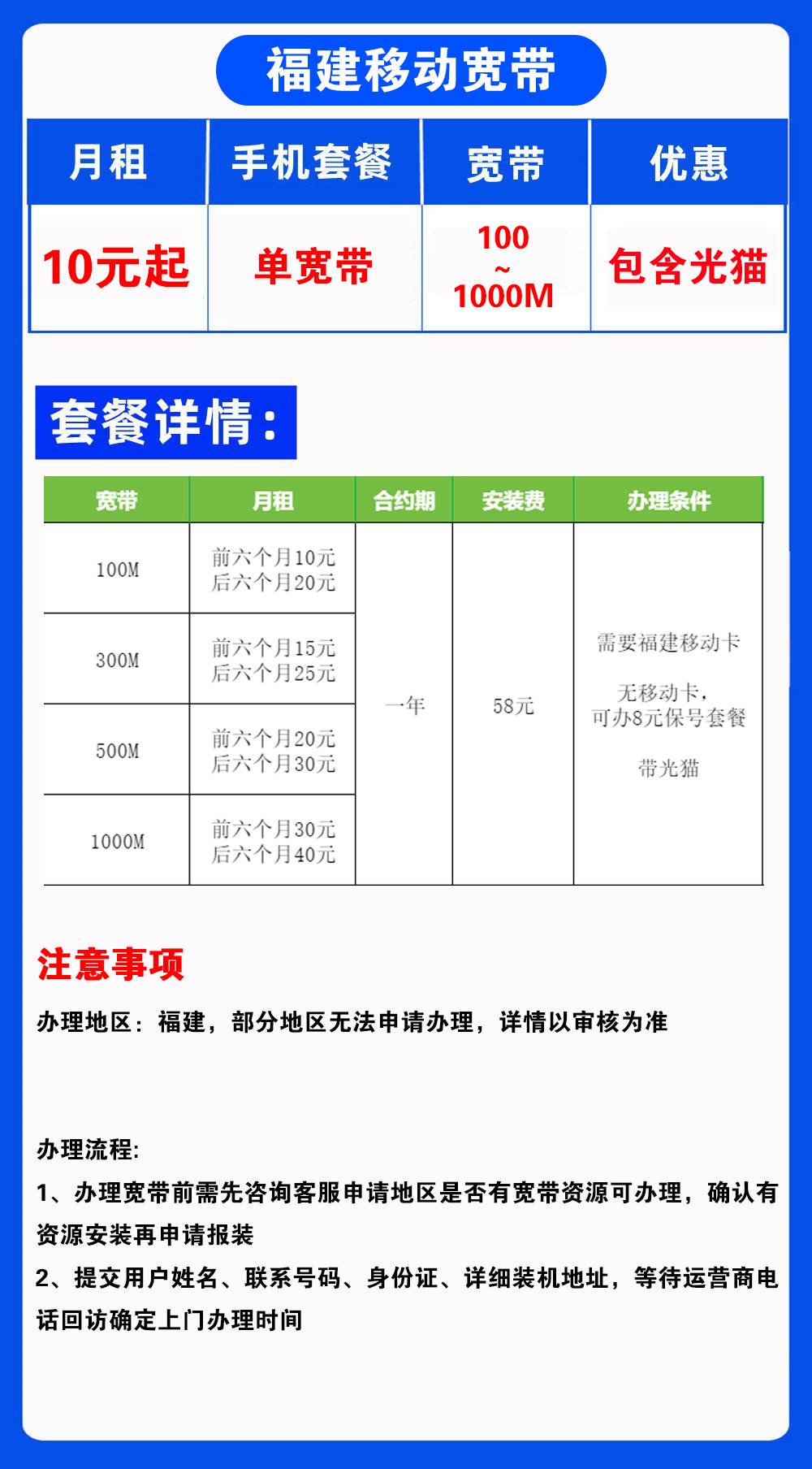 “单宽带”,”需福建移动号码”,”可办保号套餐绑定”,”半年优惠”