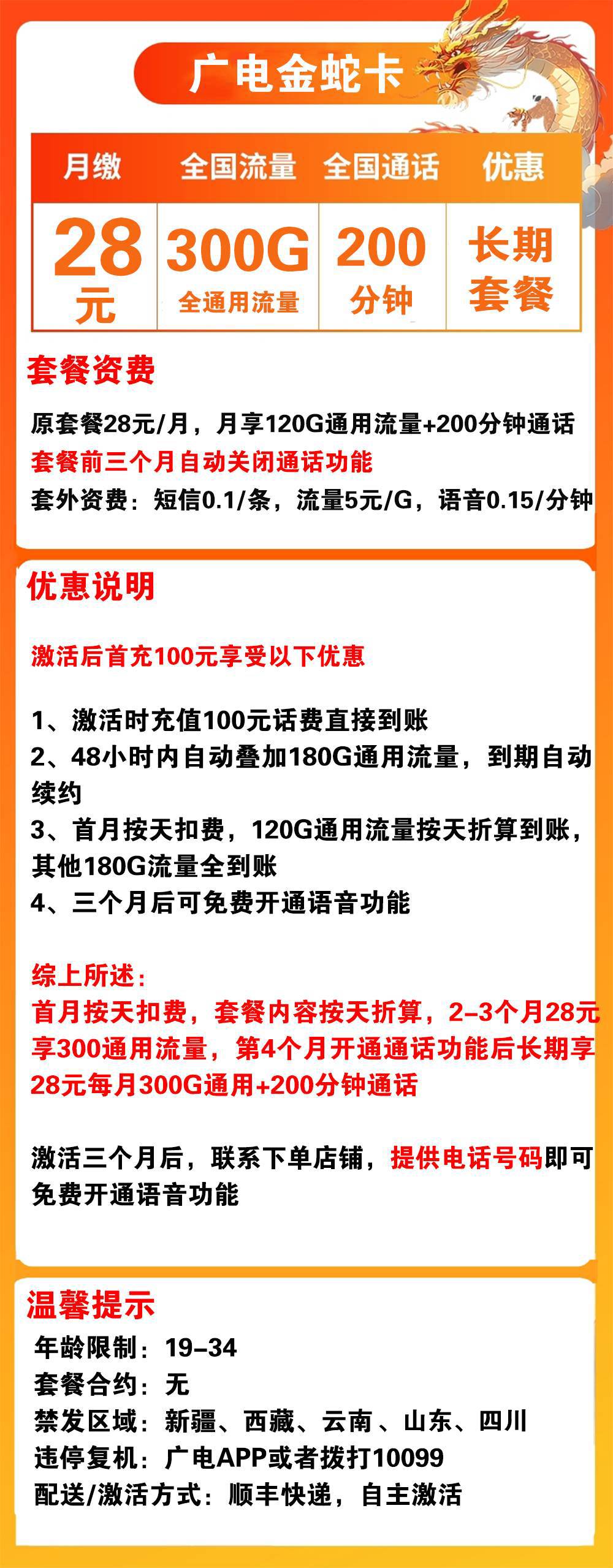 K1508/广电金蛇卡28元300G+200分钟【发全国】【长期套餐】