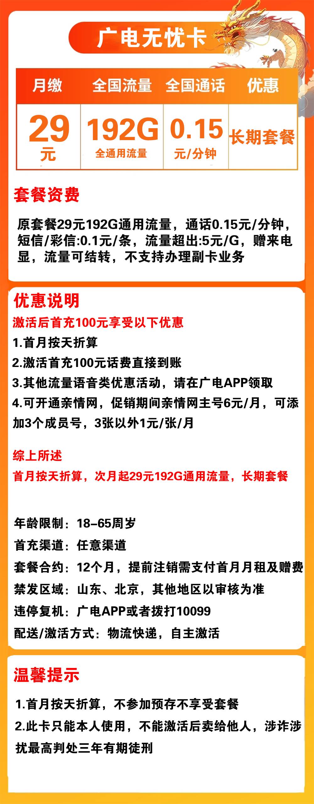 W1494/广电无忧卡29元192G流量+0.15元/分钟通话【发全国】【长期套餐】