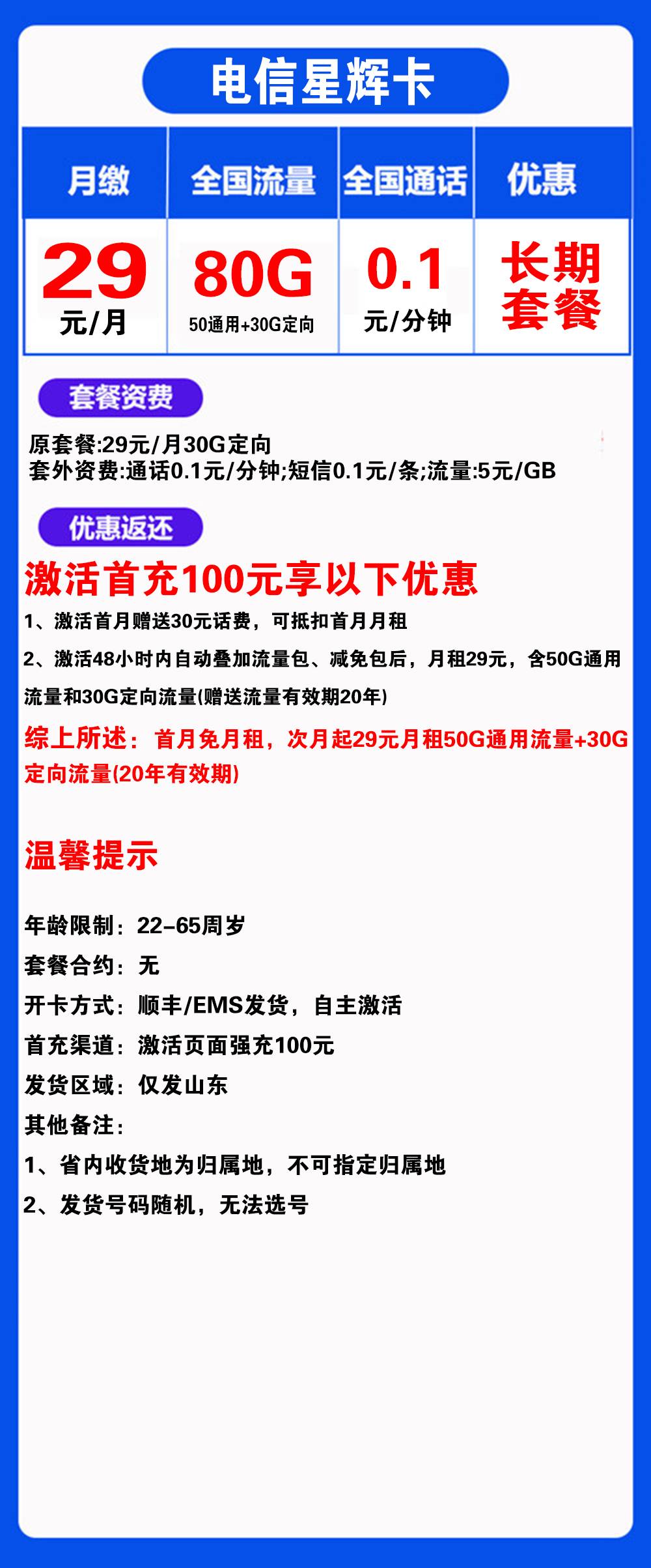 K1493/电信星辉卡29元80G流量+0.1元/分钟通话【仅发山东】【长期套餐】