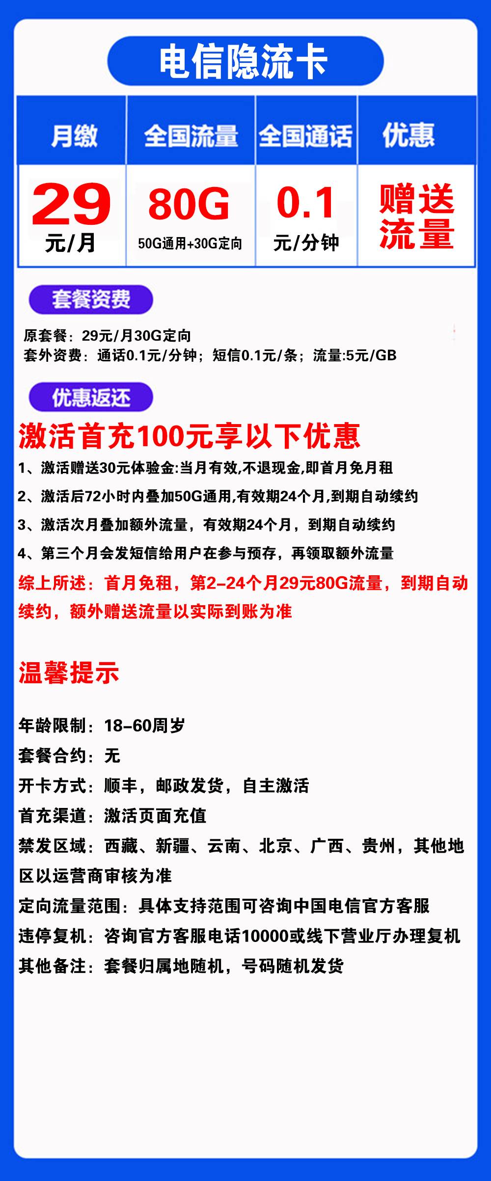 K1515/电信隐流卡29元80G流量+0.1元/分钟通话【发全国】【长期套餐】