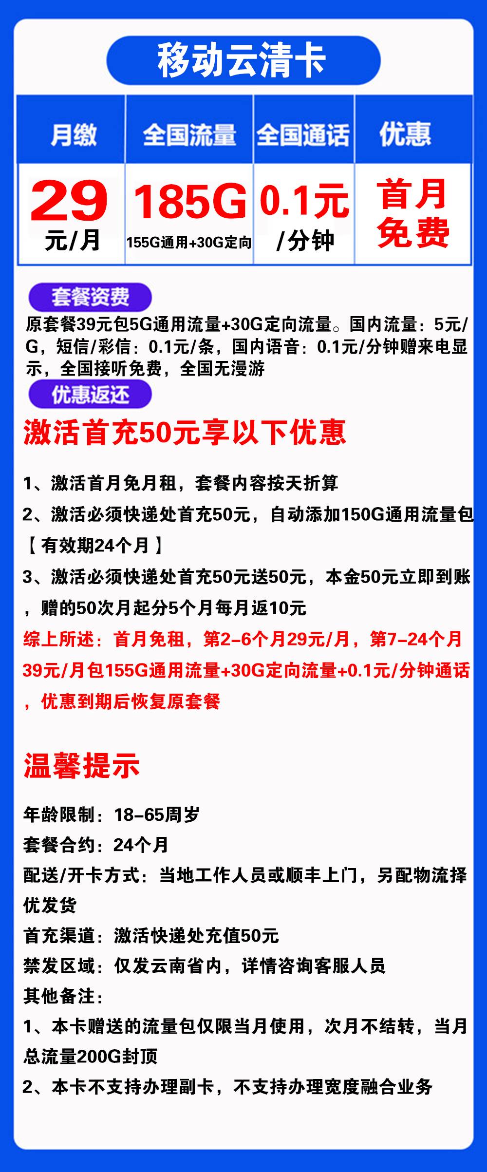 Z1516/移动云清卡29元185G流量+0.1元/分钟通话【仅发云南】