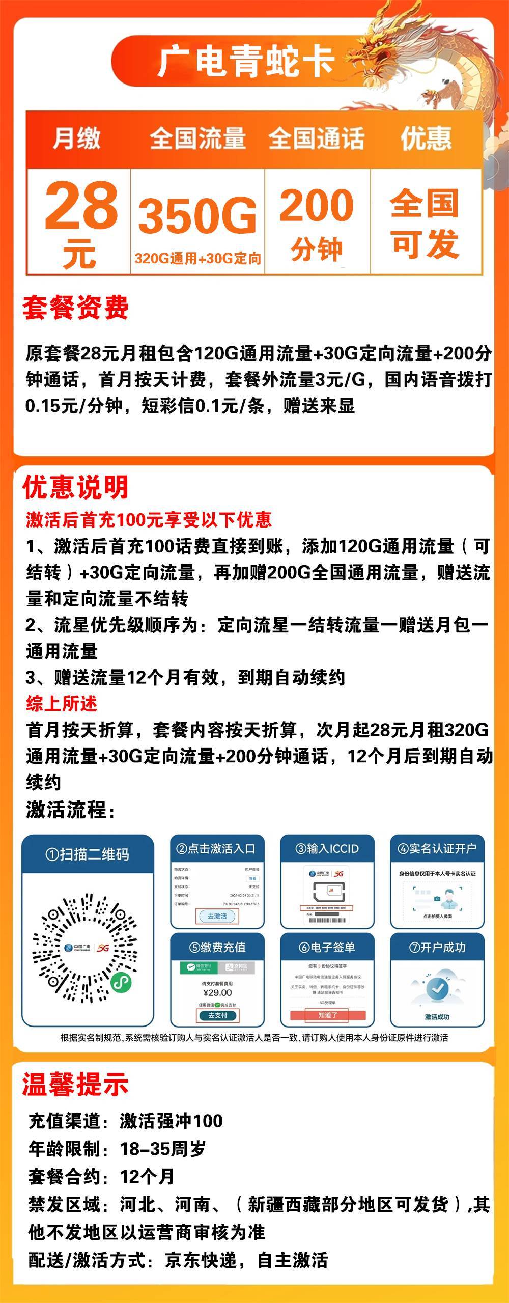 W1528/广电青蛇卡28元350G流量+200分钟通话【发全国】【长期套餐】