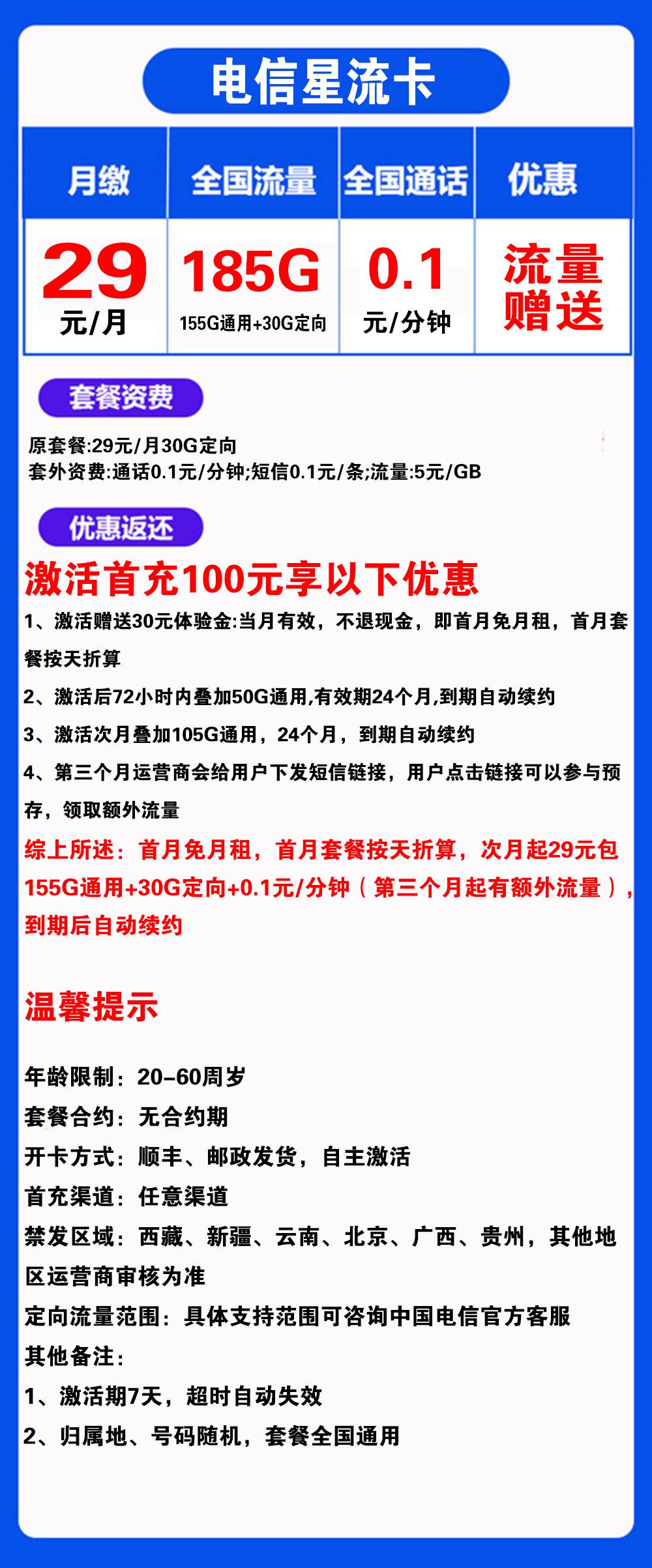 K1534/电信星流卡29元185G流量+0.1元/分钟通话【发全国】【长期套餐】