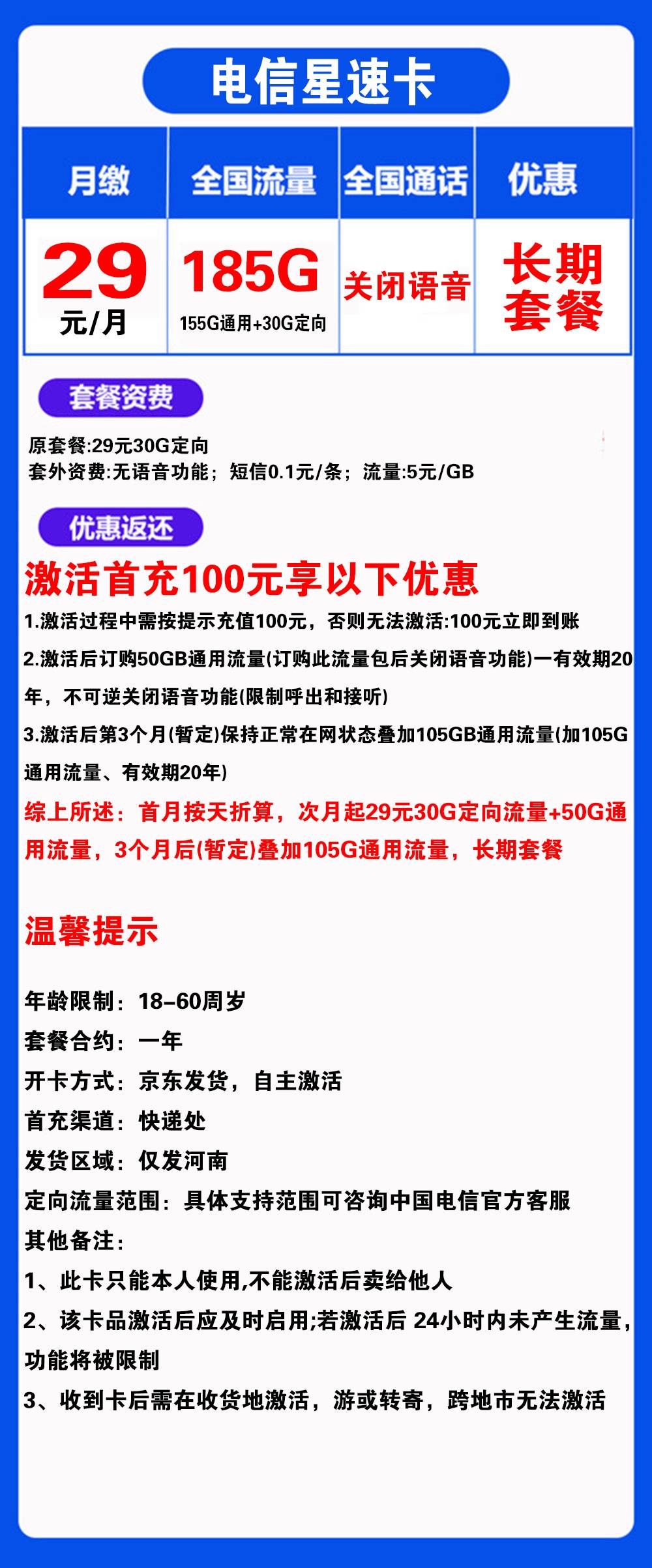 K1537/电信星速卡29元185G流量【仅发河南】【长期套餐】