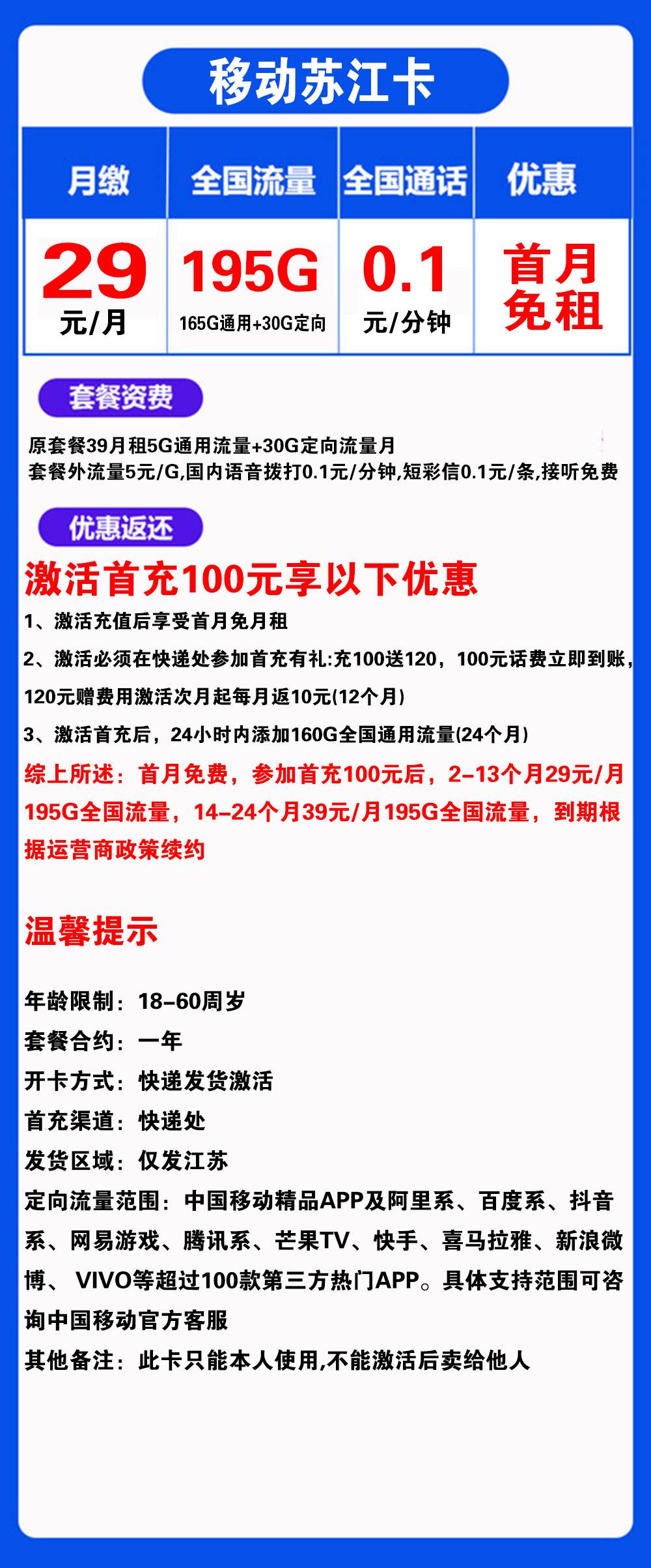 W1536/移动苏江卡29元195GB流量+0.1元/分钟通话【仅发江苏】
