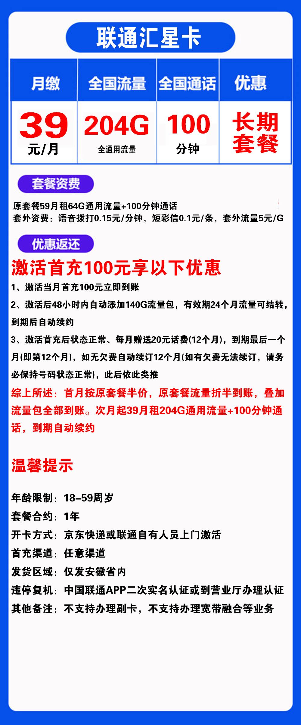 W1518/联通汇星卡39元204G流量+100分钟通话【仅发安徽】【长期套餐】