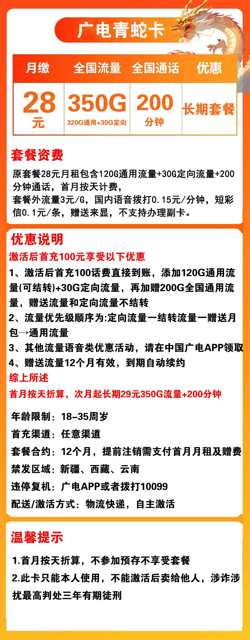 D1544/广电青蛇卡28元350G流量+200分钟通话【发全国】【长期套餐】