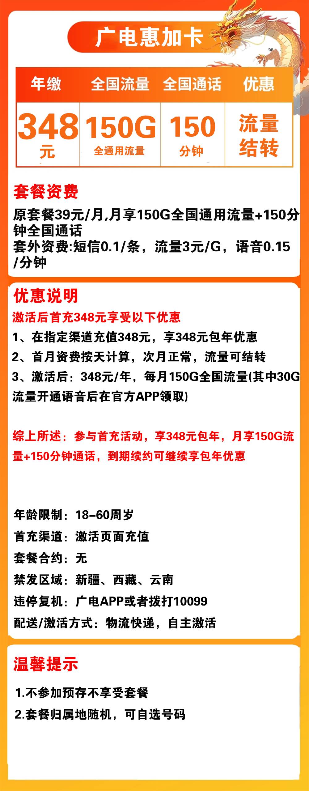 - 激活后:348元/年,每月150G全国流量(其中30G流量开通语音后在官方APP领取)