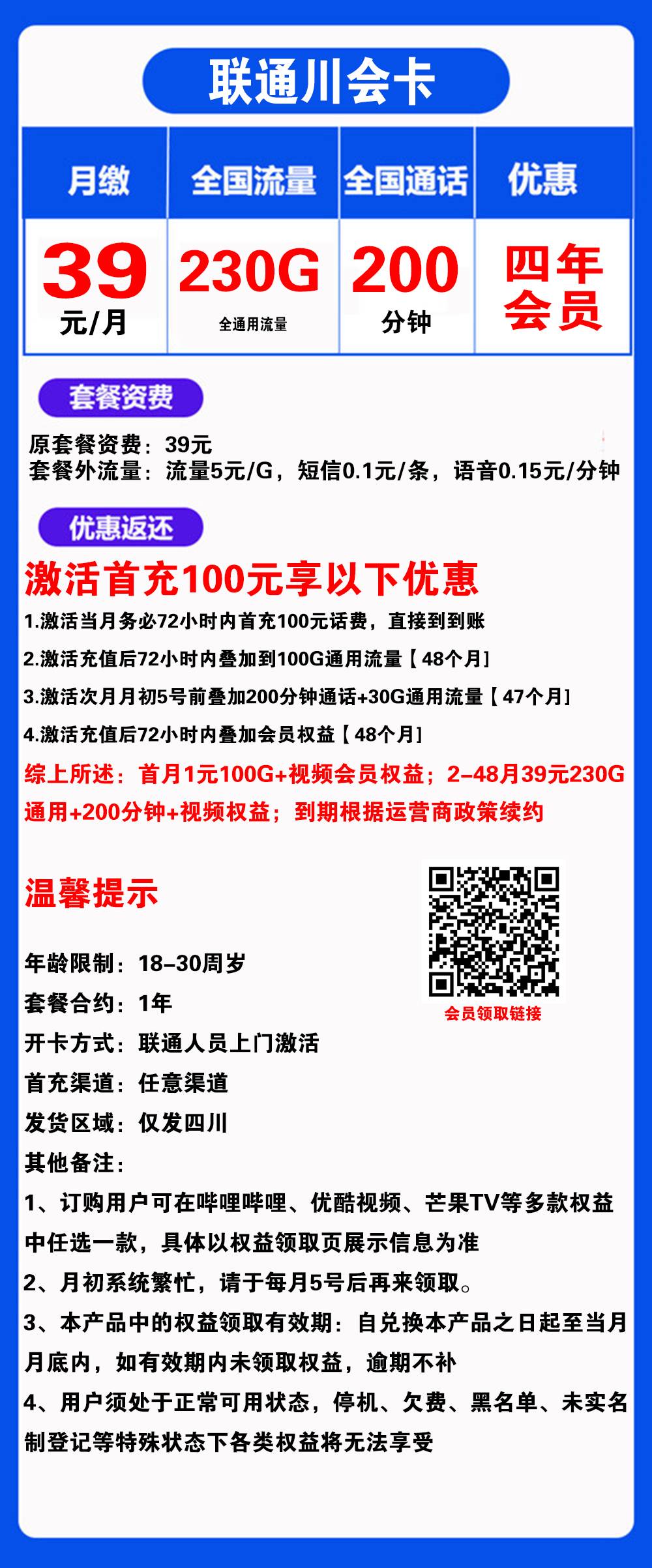 Q1551/联通川会卡39元230G流量+200分钟通话【仅发四川】