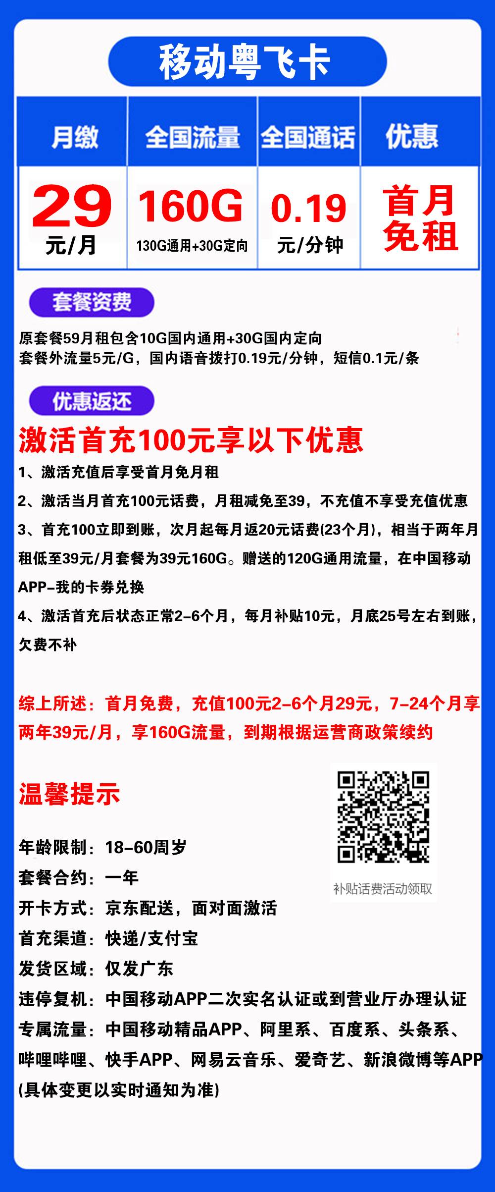 W1563/移动粤飞卡29元160G流量+0.19元/分钟【仅发广东】