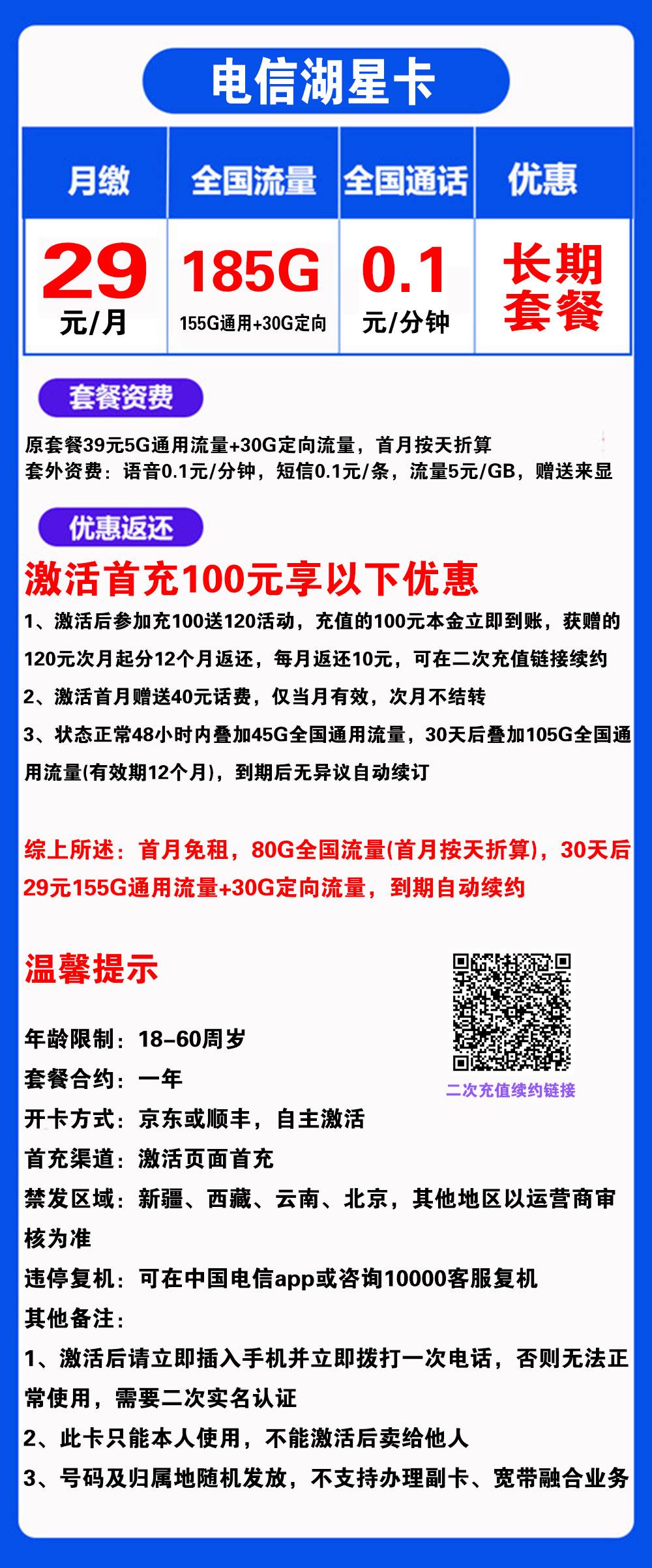 W1566/电信湖星卡29元185G流量+0.1元/分钟通话【发全国】【长期套餐】