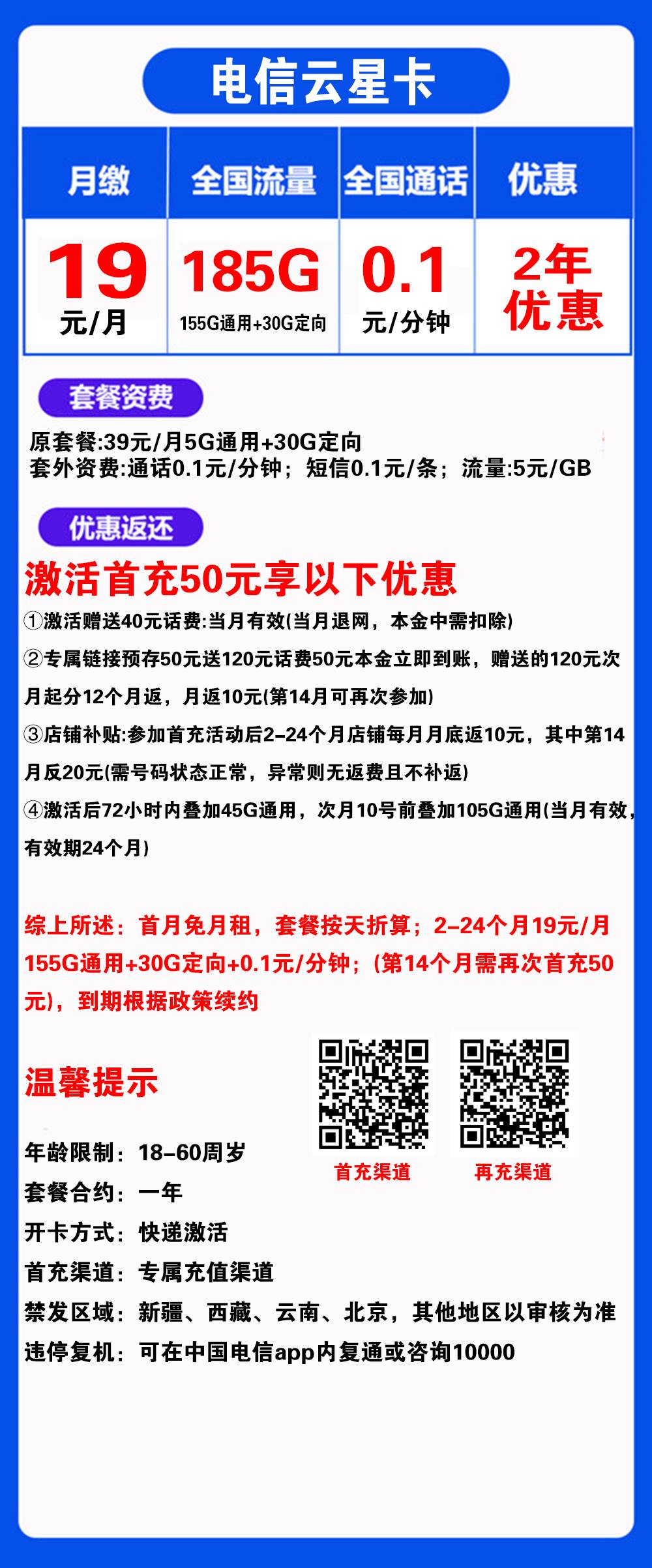 K1567/电信云星卡19元185G流量+0.1元/分钟通话【发全国】