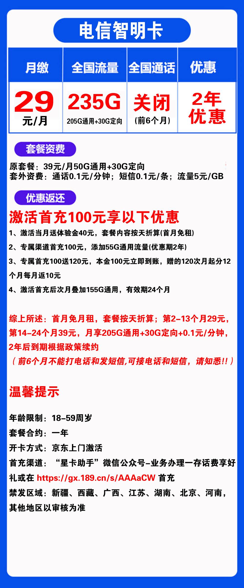 K1585/电信智明卡29元235G流量+0.1元/分钟通话【发全国】