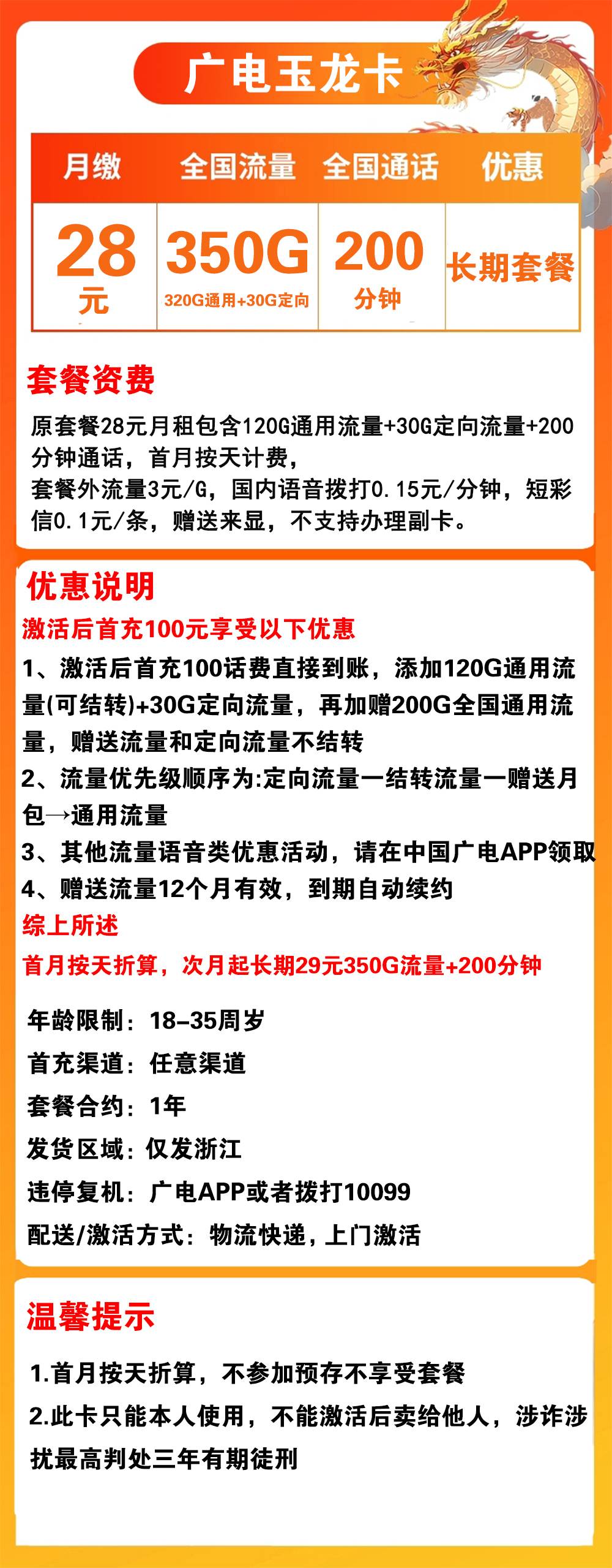 W1594/广电玉龙卡28元350G流量+200分钟通话【仅发浙江】【长期套餐】