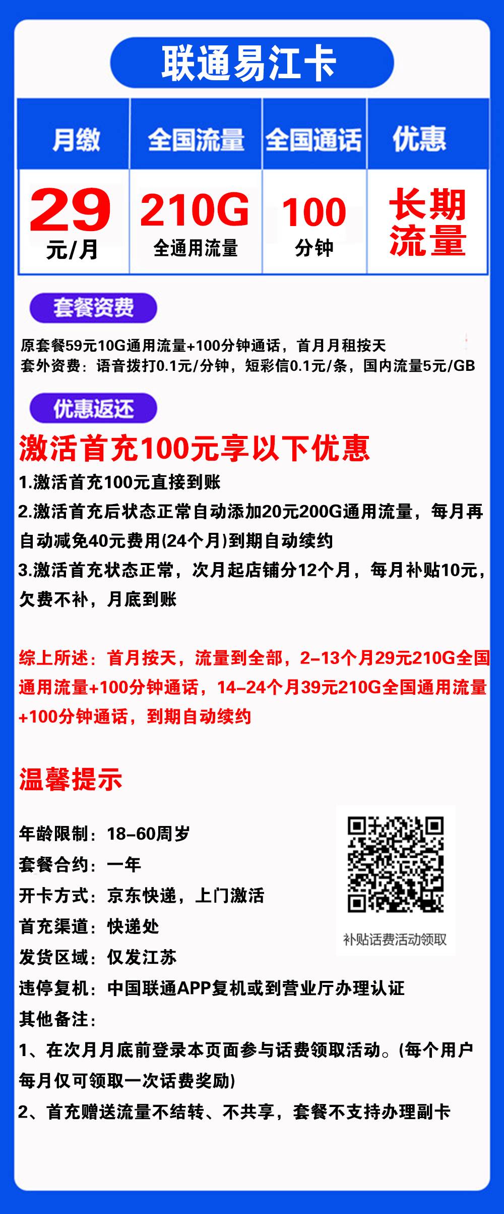 W1597/联通易江卡29元210G流量+100分钟通话【仅发江苏】【长期流量】