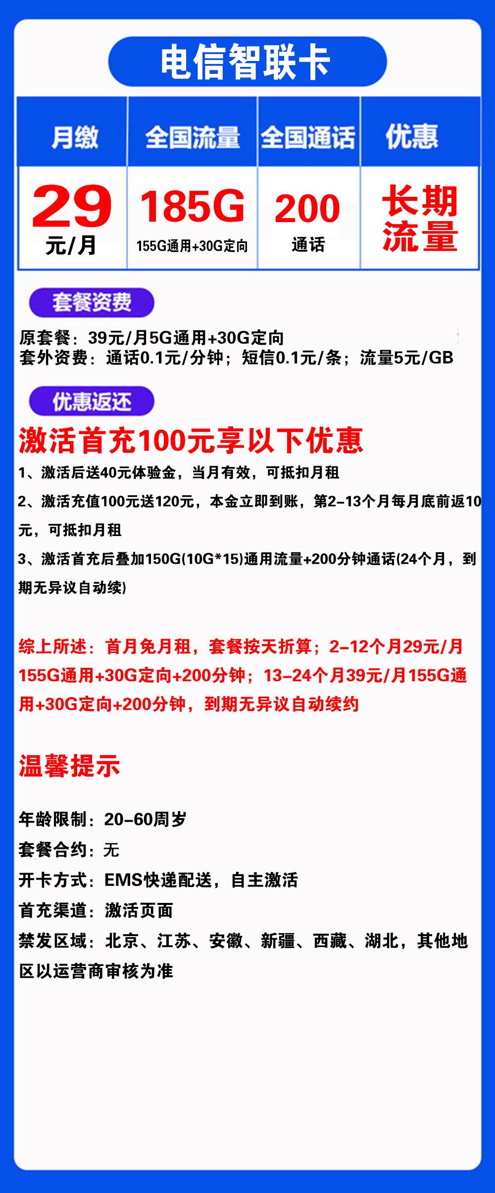 K1588/电信智联卡29元185G流量+200分钟通话【发全国】【长期流量】