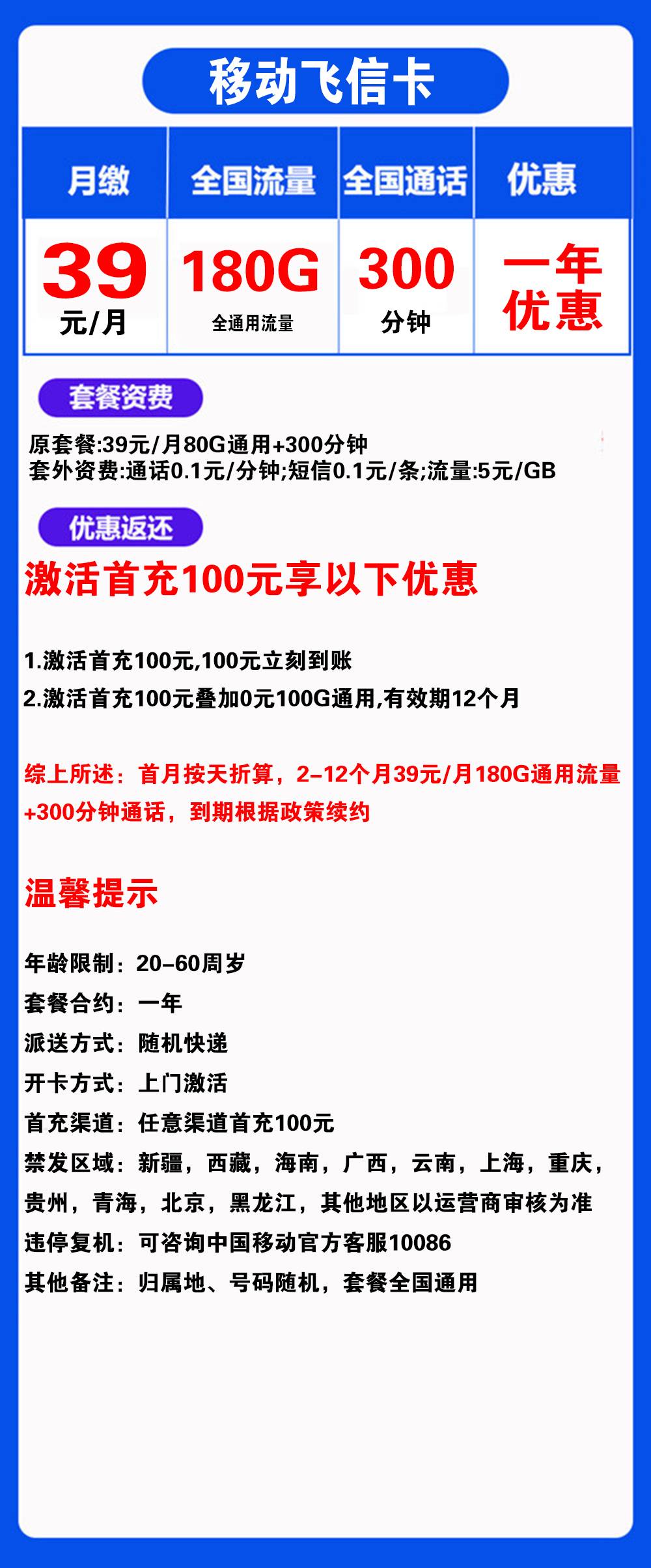 Q1603/移动飞信卡39元180G流量+300分钟通话【发全国】