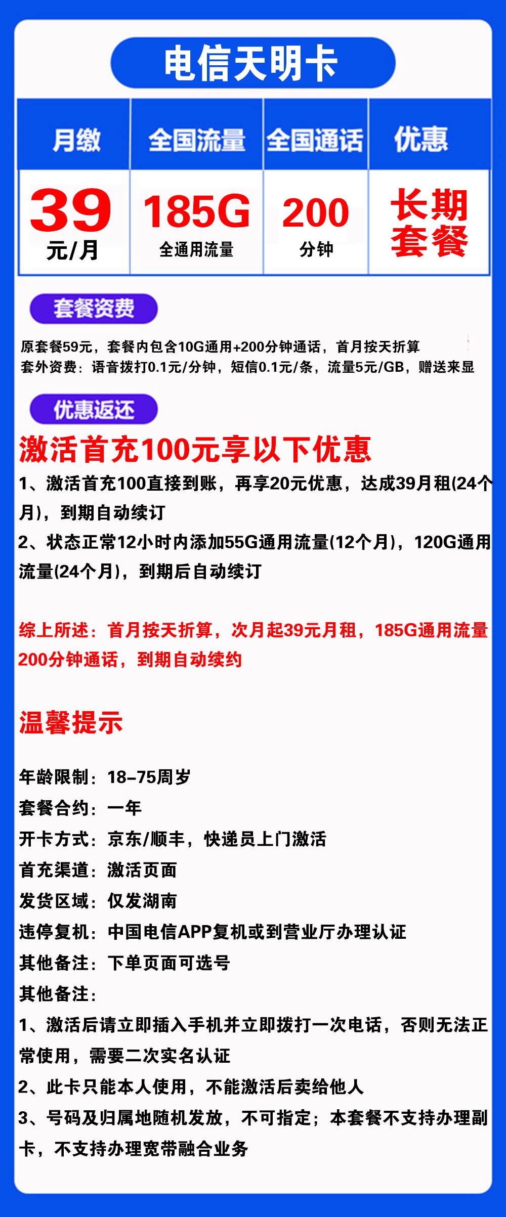 - 次月起:39元月租,185G通用流量,200分钟通话,到期自动续约