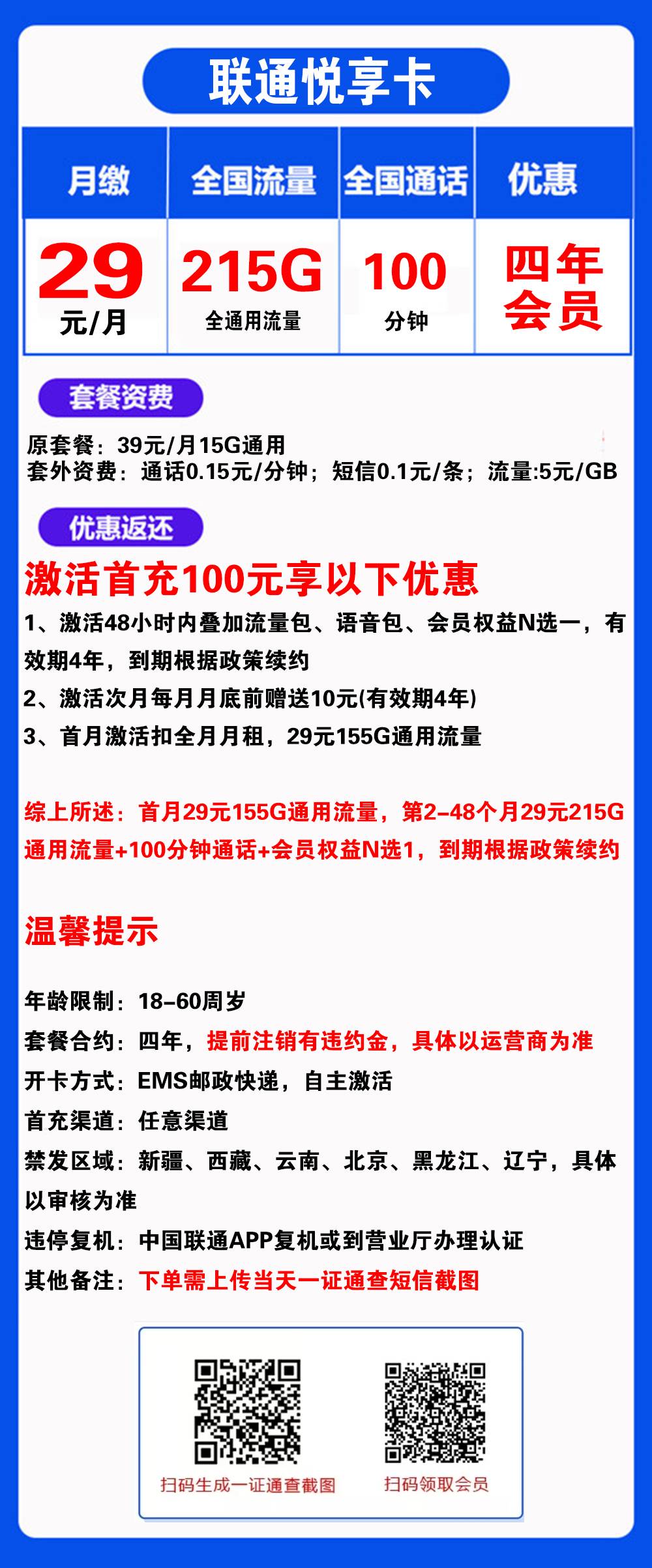 - 第2-48个月:29元,215G通用流量 + 100分钟通话 + 会员权益N选一