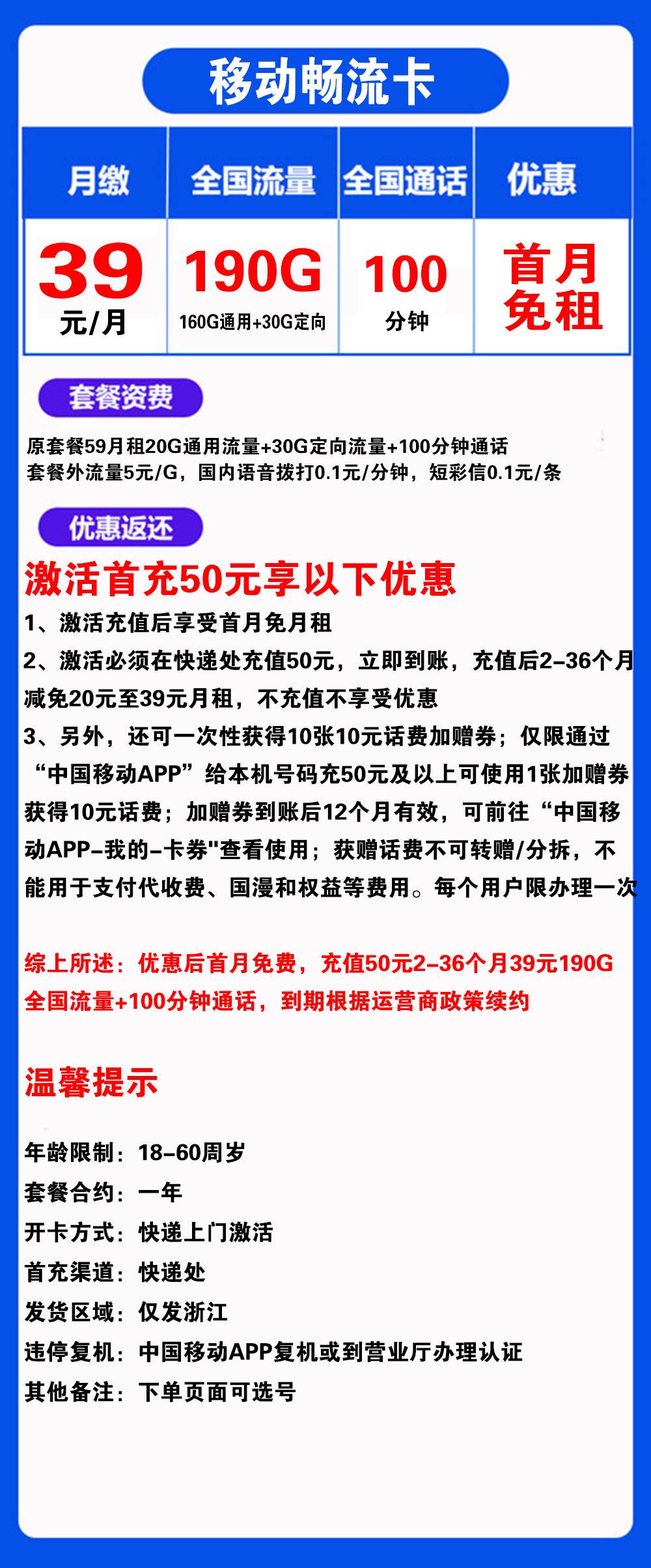 W1612/移动畅流卡39元190G流量+100分钟通话【仅发浙江】
