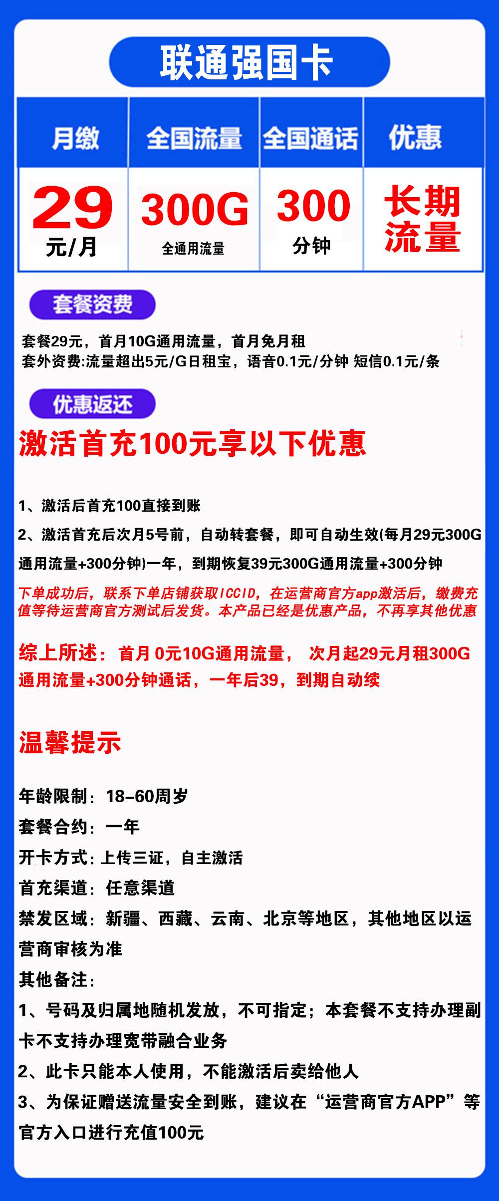 联通强国卡月缴全国流量全国通话优惠:29元/月,300G通用流量+300分钟