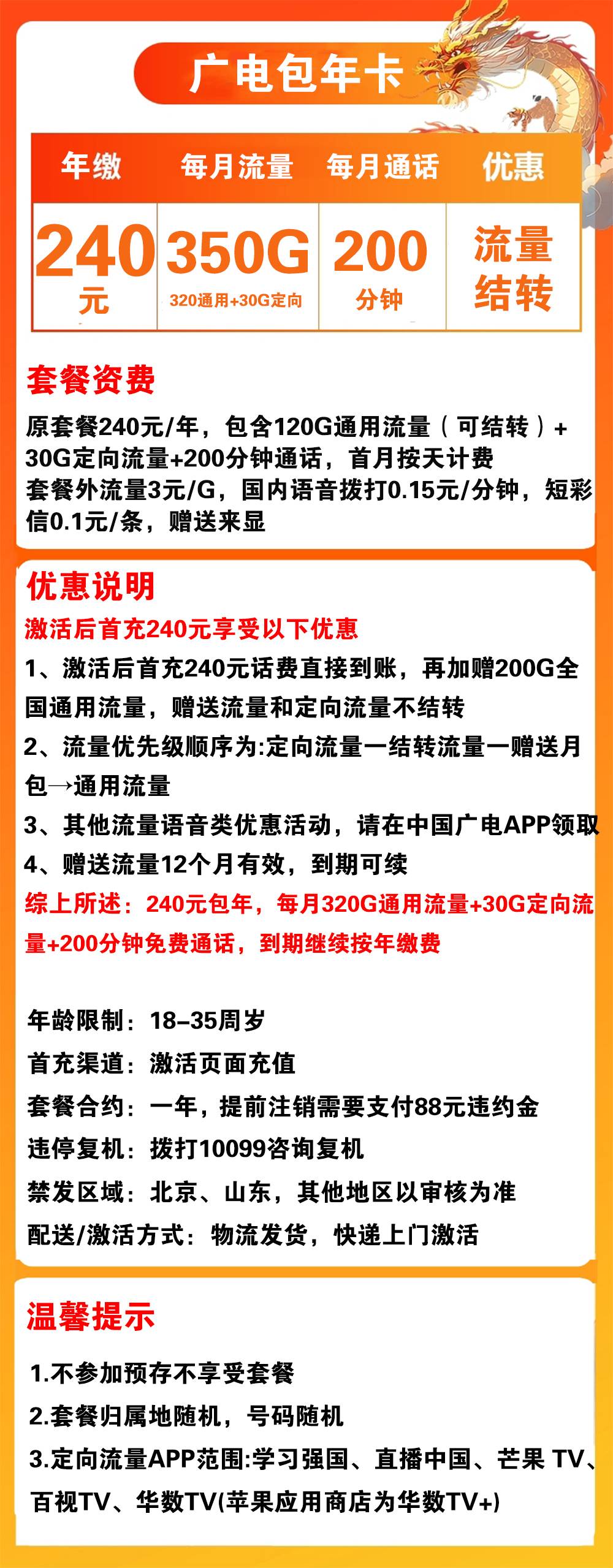 - 激活后首充240元话费直接到账,再加赠200G全国通用流量。