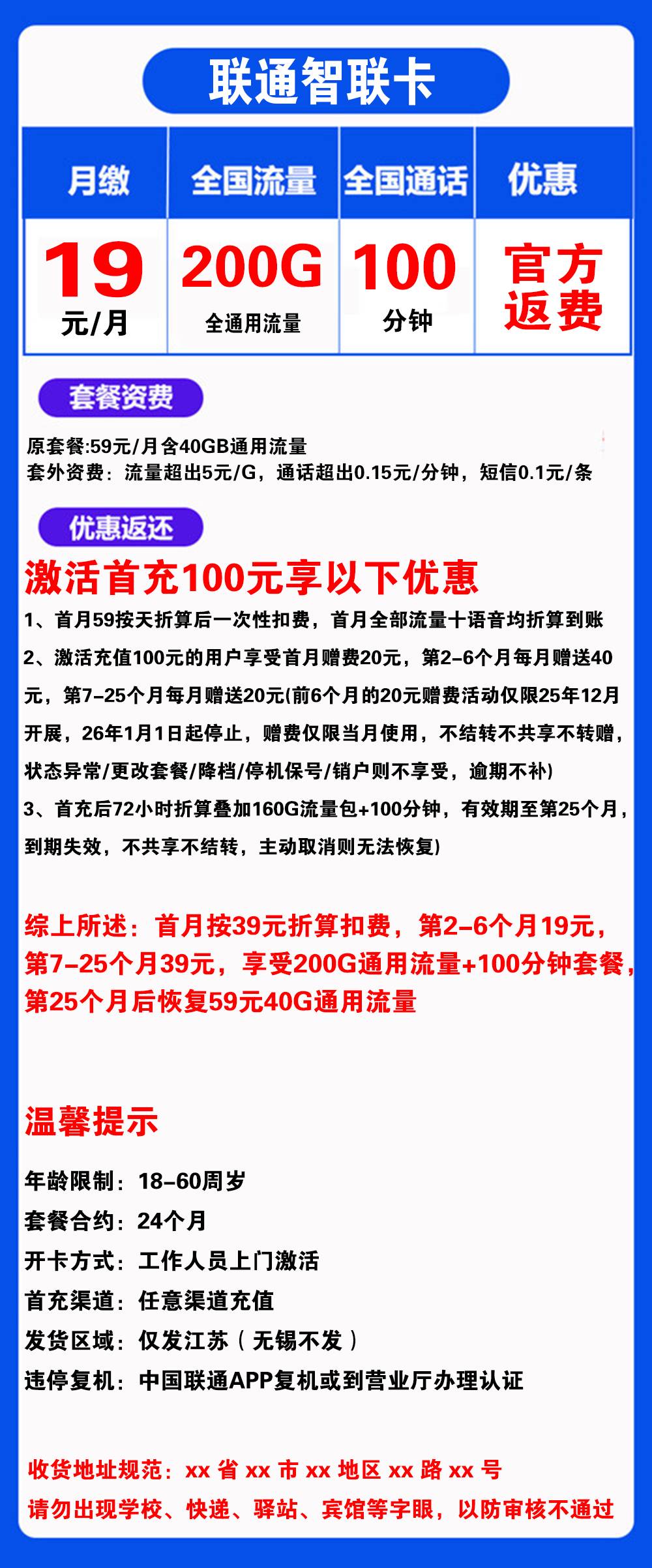 F1634/联通智联卡19元200G流量+100分钟通话【仅发江苏】