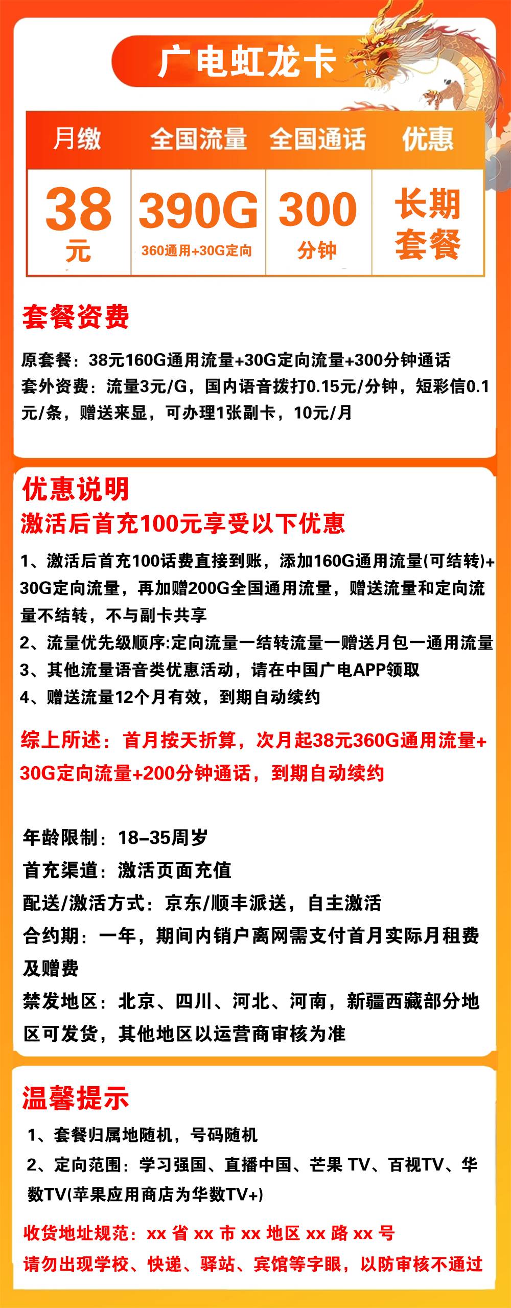 F1631/广电虹龙卡38元390G流量+300分钟通话【发全国】【长期套餐】
