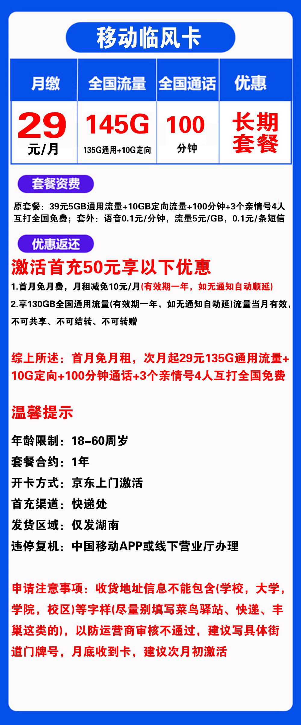 F1643/移动临风卡29元145G流量+100分钟通话【仅发湖南】【长期套餐】
