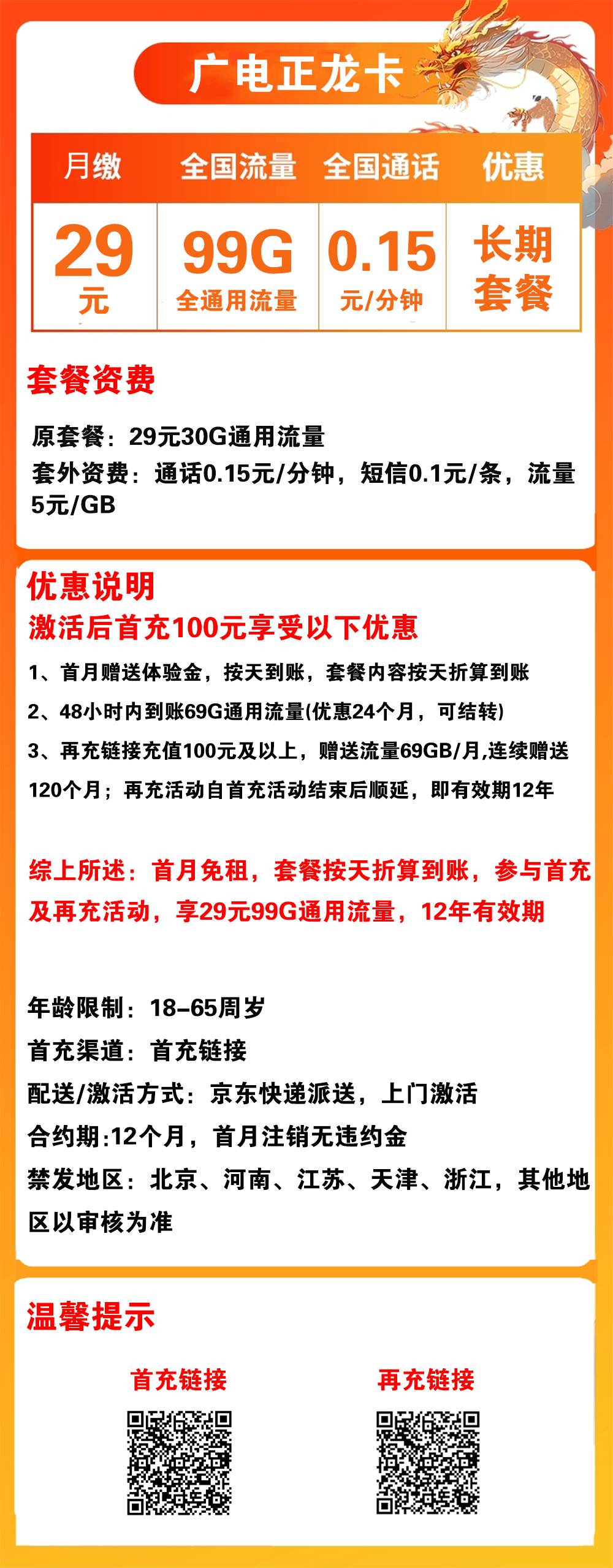 优惠套餐:29元/99G通用流量,全国通话0.15元/分钟