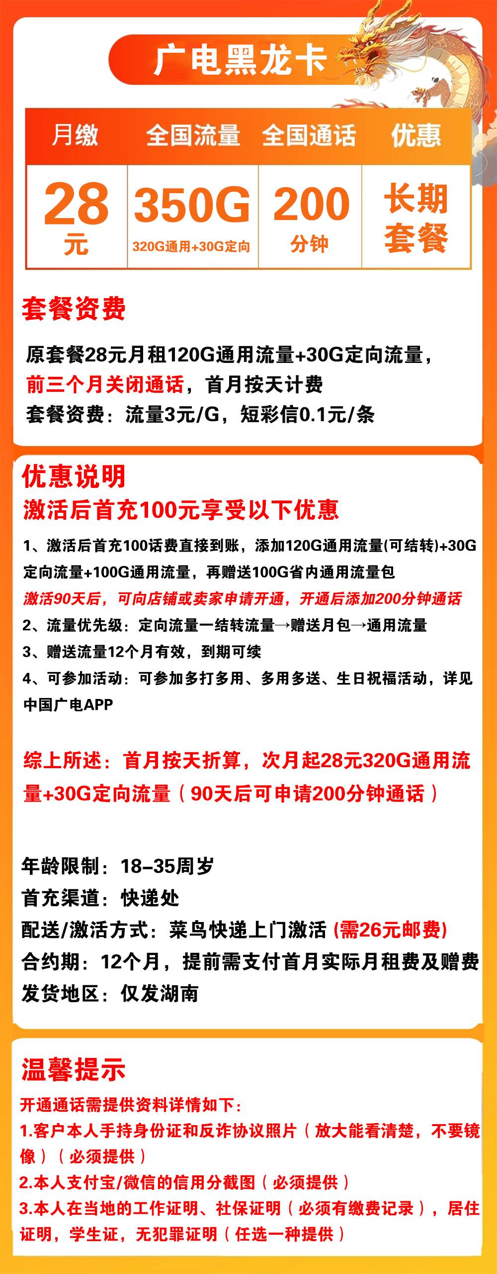 K1662/广电黑龙卡28元350G流量+200分钟通话【仅发湖南】【长期套餐】
