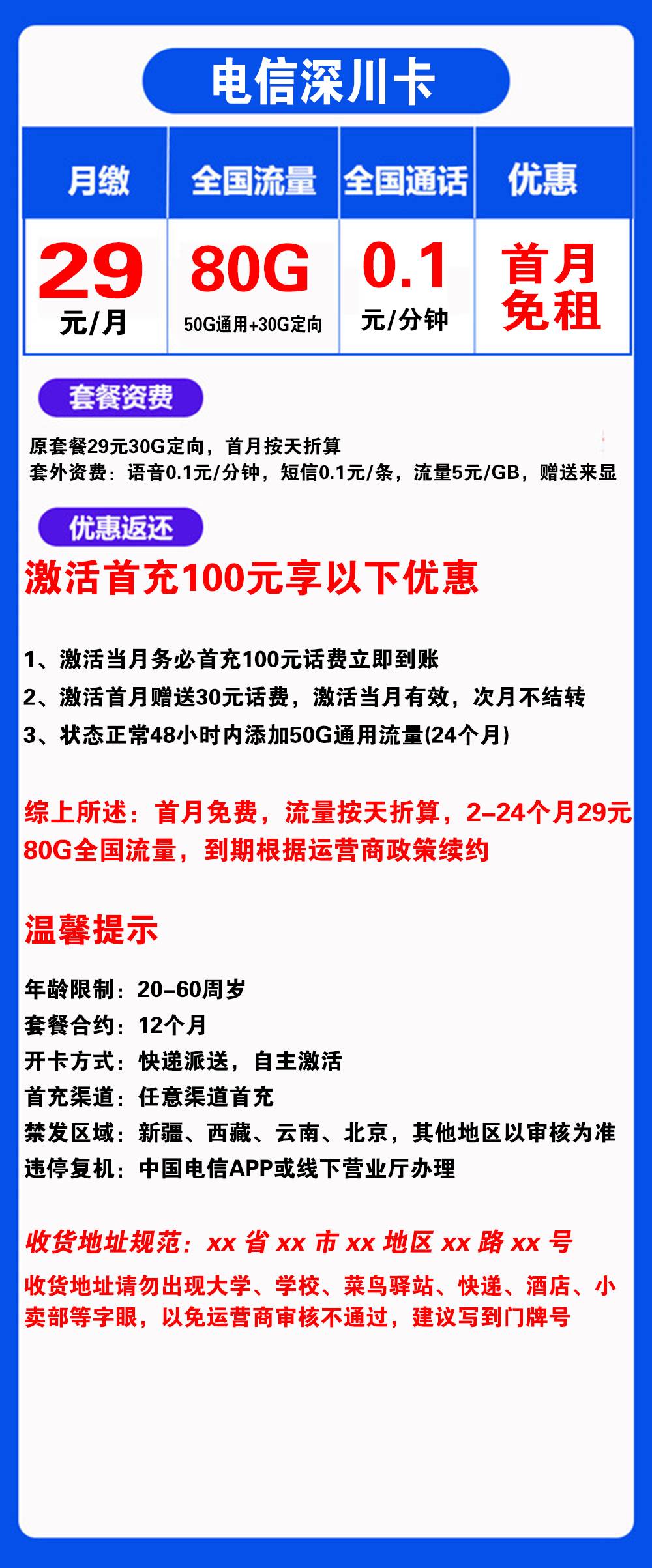 “归属地:深圳”,”首月免租”,”2年套餐”,”办卡年龄:20-60”