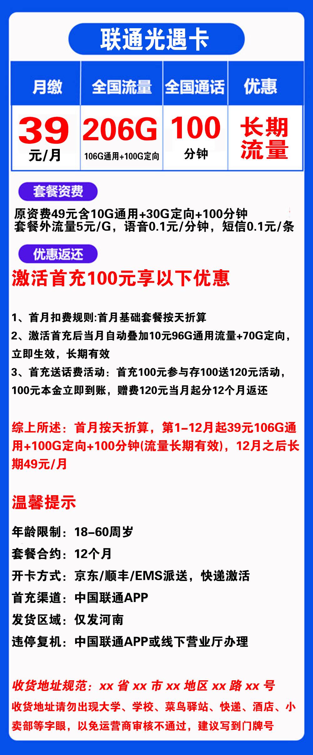 F1676/联通光遇卡39元206G流量卡+100分钟通话【仅发河南】【长期流量】