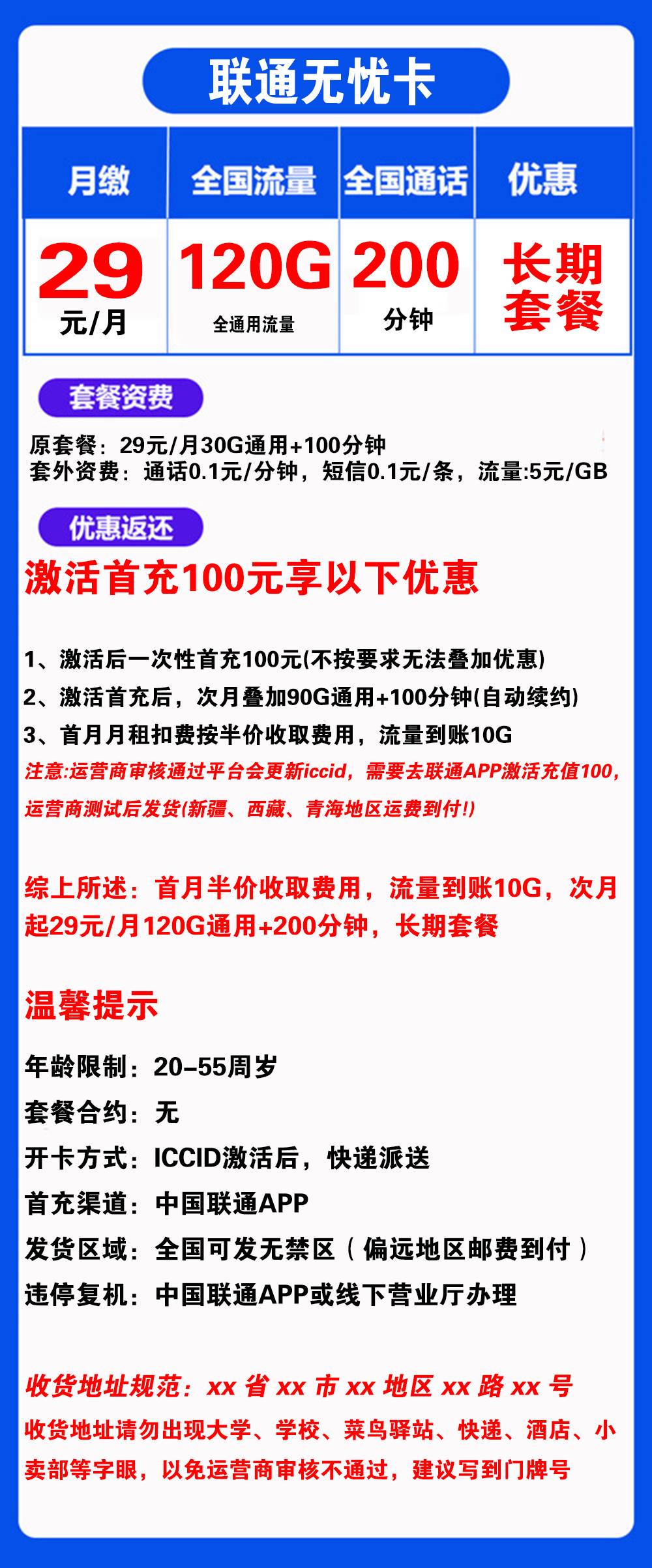 K1678/联通无忧卡29元120G流量+200分钟通话【发全国】【长期套餐】