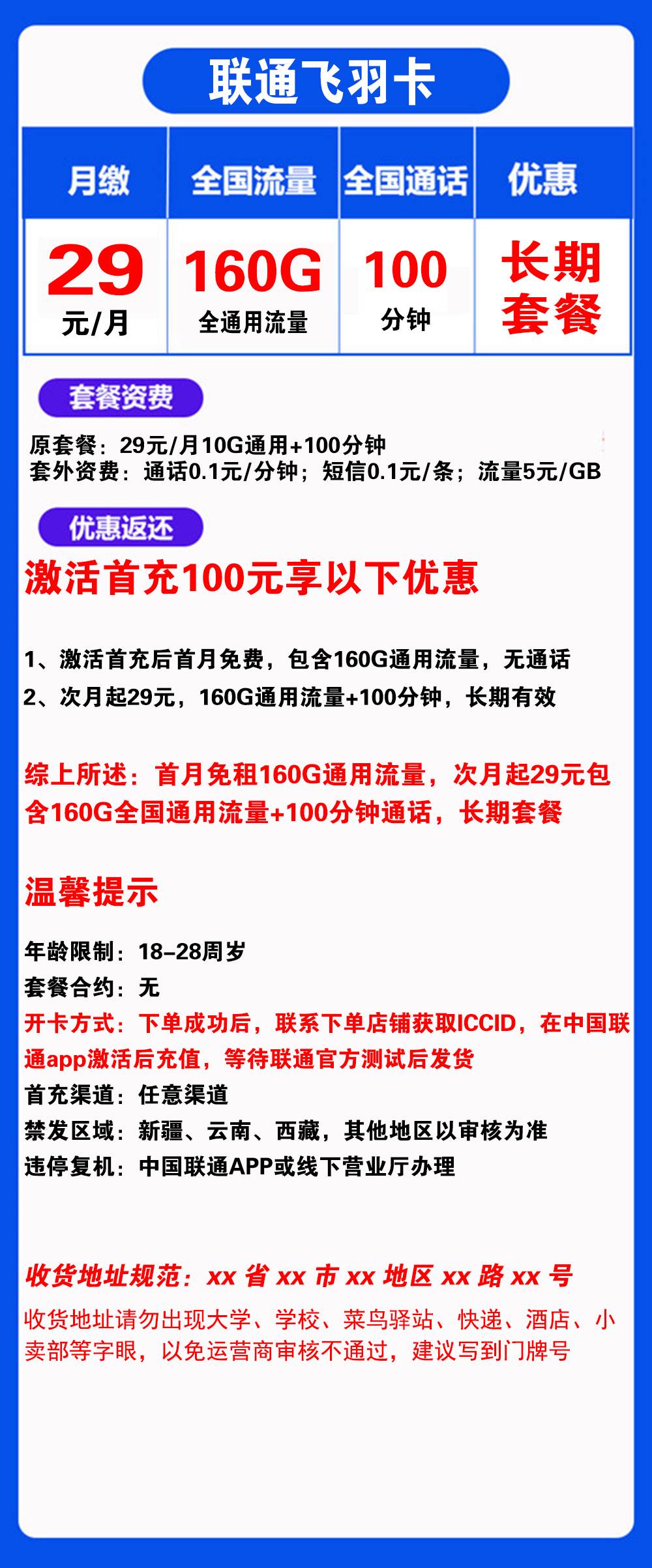 K1679/联通飞羽卡29元160G流量+100分钟通话【发全国】【长期套餐】