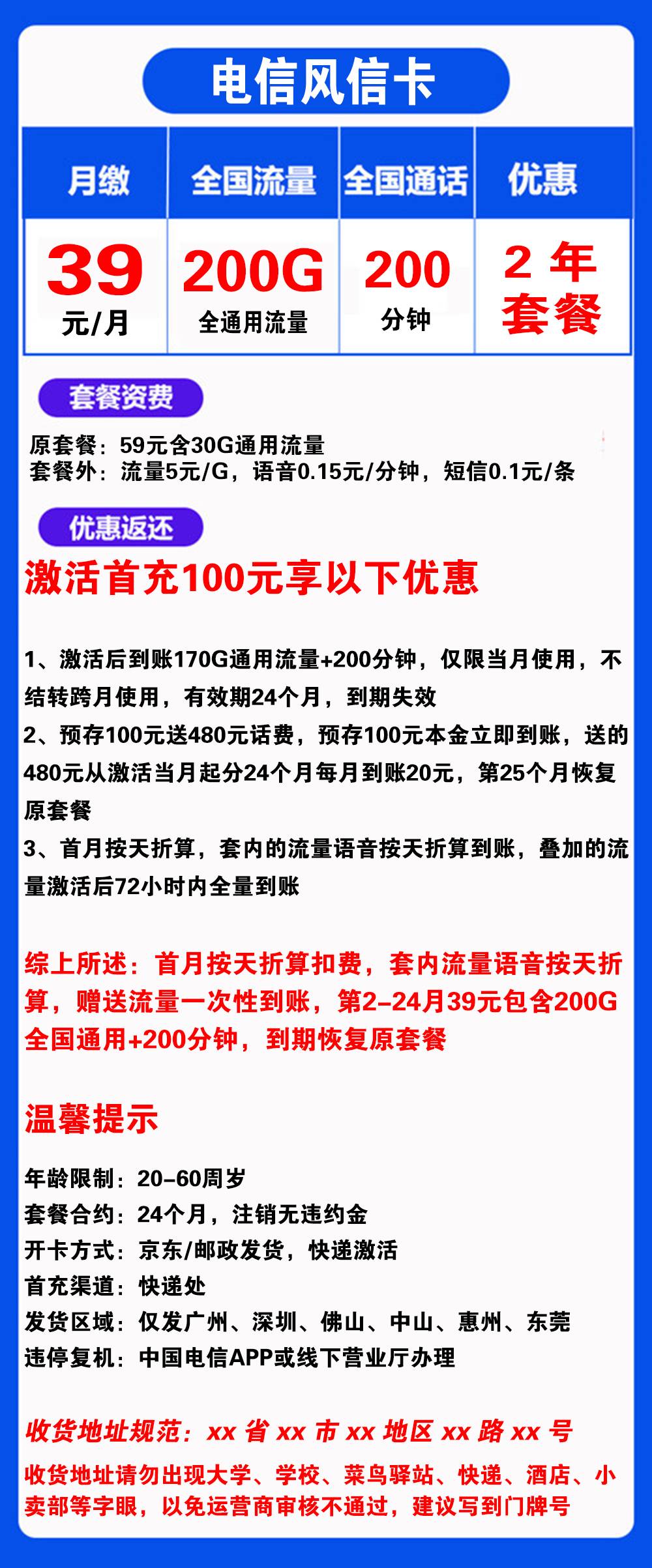 - 收货地址请勿出现大学、学校、菜鸟驿站、快递、酒店、小卖部等字眼,以免运营商审核不通过