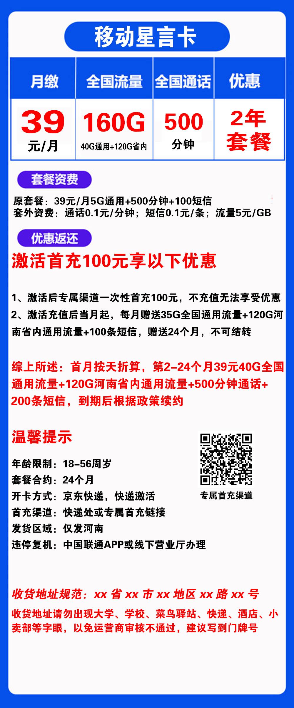 K1684/移动星言卡39元160G流量+500分钟通话+200条短信【仅发河南】